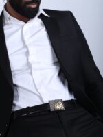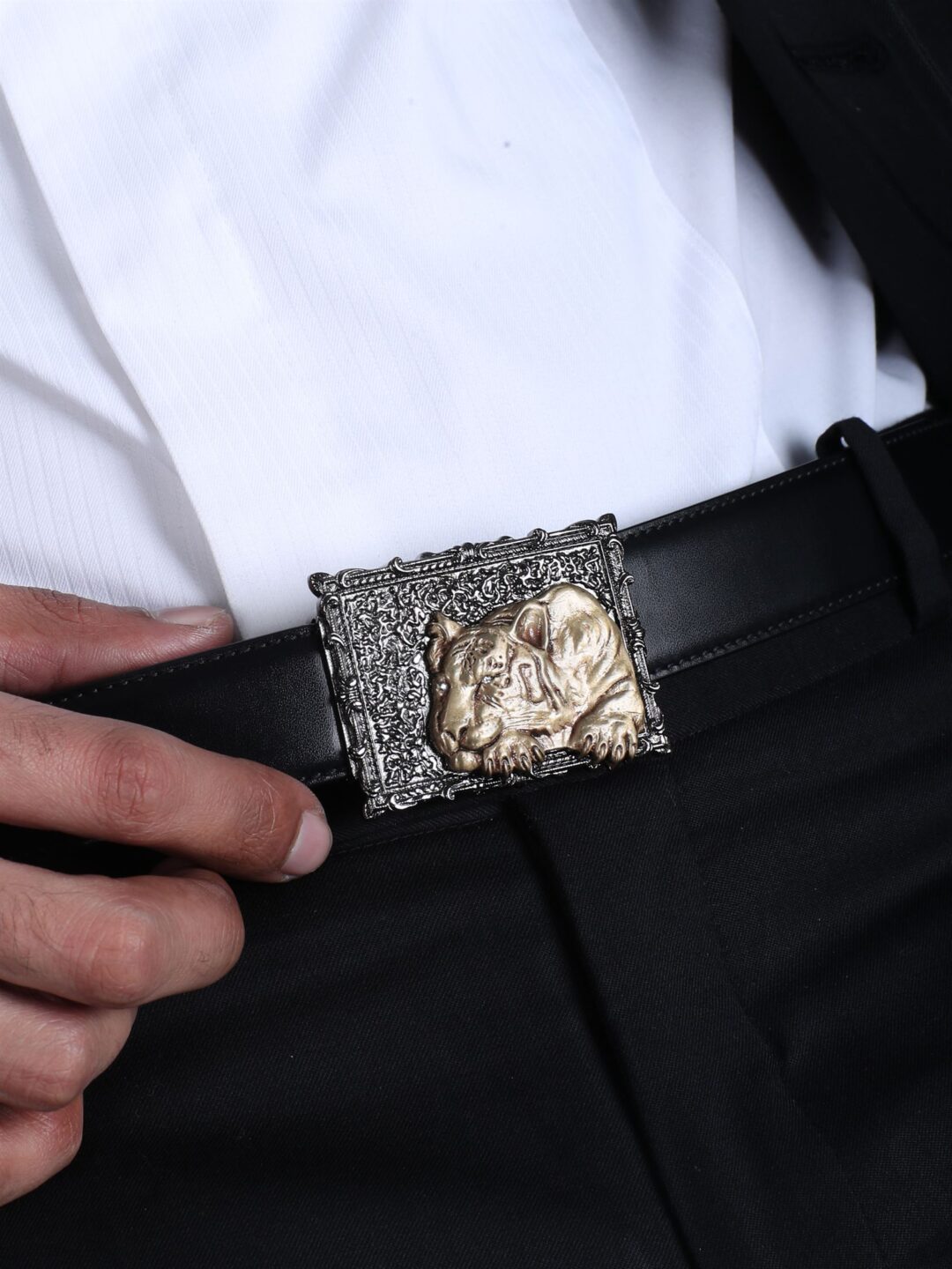The style of the belt and buckle is a fresh take on the plain old leather belt. The contrasting two-tone texture with an unmissable lustrous buckle is designed keeping in mind a personalised style and countless styling options. Tiger has long been used to represent royalty, fierceness and design aesthetics. This belt is certainly a timeless wardrobe staple