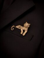 This brooch masterfully captures the regal poise of a tiger in repose, exuding both tranquility and an unspoken command of its surroundings. The detailed stripes and sculpted form give it an aura of lifelike elegance, while its placement in the pocket makes it seem as though the tiger itself is watching over its domain. The Enigmatic Stripes Brooch is a statement of untamed power, designed for the modern man who wears confidence as naturally as the tiger wears its stripes.