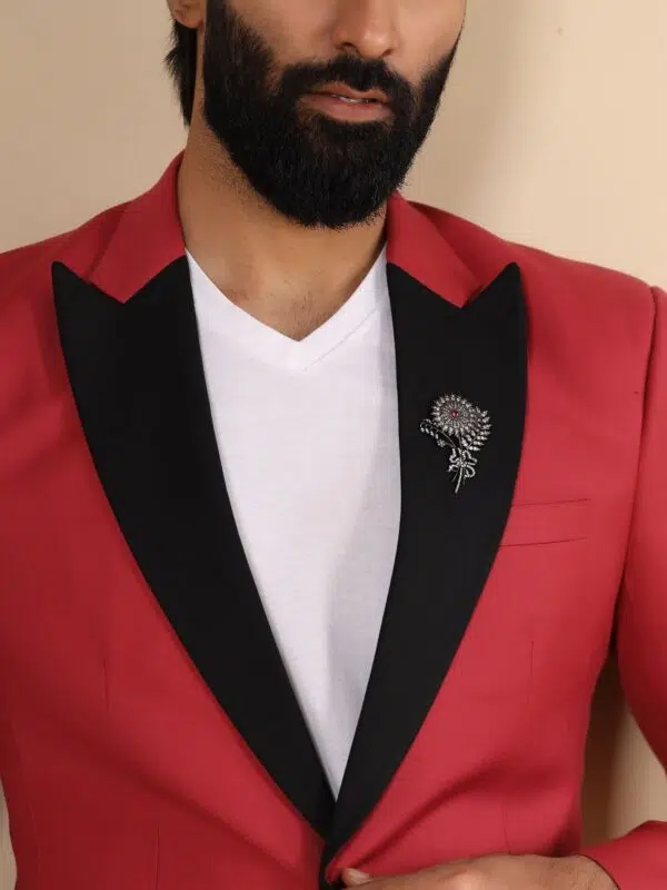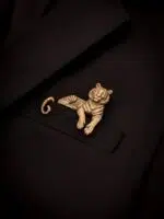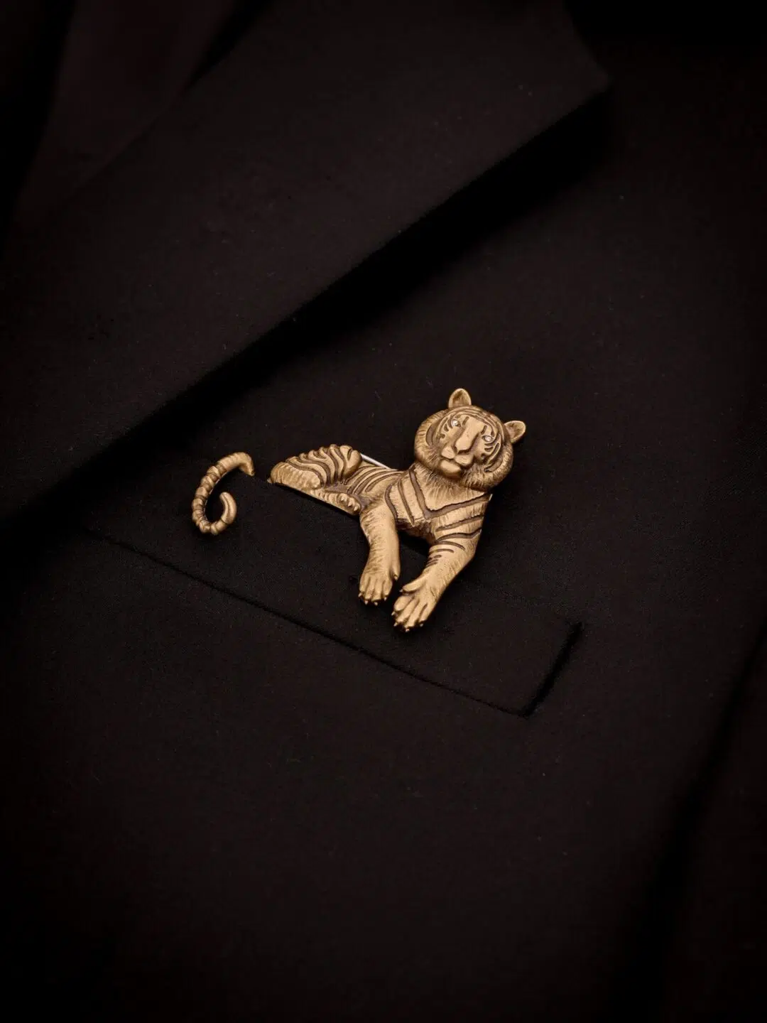 This brooch masterfully captures the regal poise of a tiger in repose, exuding both tranquility and an unspoken command of its surroundings. The detailed stripes and sculpted form give it an aura of lifelike elegance, while its placement in the pocket makes it seem as though the tiger itself is watching over its domain. The Enigmatic Stripes Brooch is a statement of untamed power, designed for the modern man who wears confidence as naturally as the tiger wears its stripes.