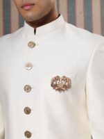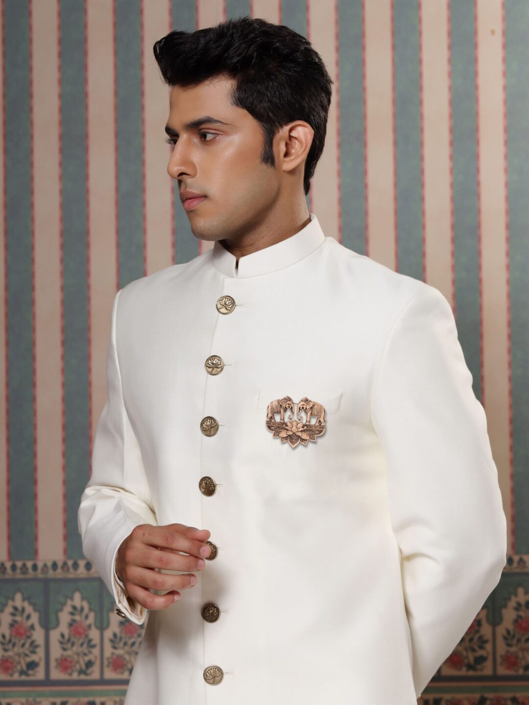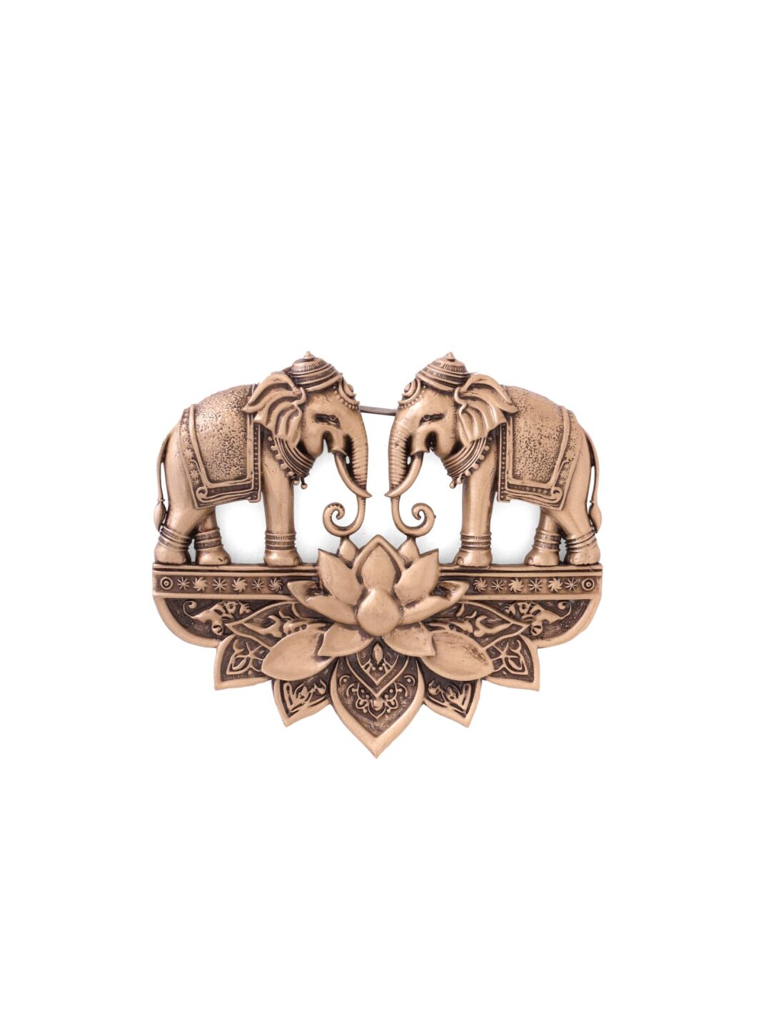 The brooch is a canvas where metal meets myth. Two elephants stand in a silent conversation, their trunks and tusks locked in an eternal greeting. The lotus below is not just a flower; it?s the earth, cradling its children in a floral embrace.
