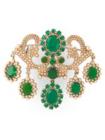 Discover the Magnificent Stud Brooch by Cosa Nostraa that combines the enchanting allure of green diamond studs with an elegant and timeless design. Artistically crafted, this brooch is a celebration of opulence and refinement, showcasing a captivating blend of sparkling green diamond studs set against a backdrop of intricate patterns. Glorify your attire with this extraordinary accessory, perfect for making a lasting impression.