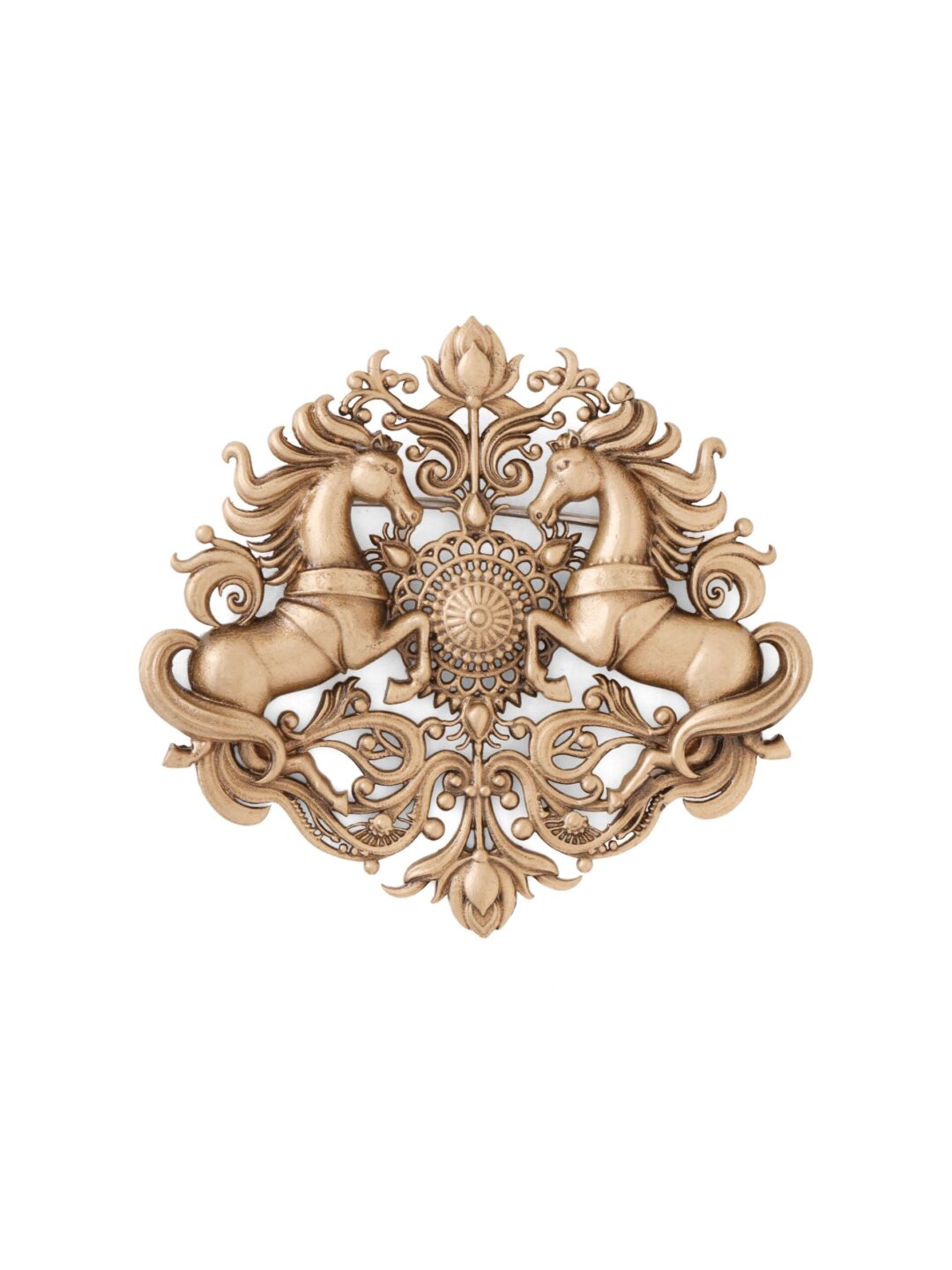 The brooch showcases a powerful motif inspired by the grandeur of historical equestrian traditions. Horses, revered throughout history as symbols of freedom, strength, and nobility, are central to this design. The depiction of two rearing horses is reminiscent of the noble steeds often found in ancient heraldry and royal emblems, where they signified valor and endurance. The central circular pattern, with its intricate detailing, draws from the rich artistic traditions of ancient civilizations, echoing the eternal cycle of life and the unbroken bond between nature and humanity.