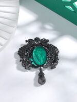 This brooch showcases a regal aesthetic, with the peacock motifs adorned by a captivating green gemstone. Its balanced form ensures easy integration on clothing and accessories.