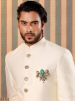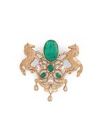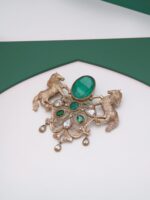 The “Roshan-e-Sawaar Brooch” is an enchanting ode to untamed beauty. This captivating accessory showcases two intricately designed galloping horses, adorned with four stunning green gemstones that exude elegance and vitality. The Glitter Horse Brooch captures the untamed grace and boundless energy of these majestic creatures, empowering every modern individual to embrace their inner strength and free spirit. With its dazzling beauty and symbolic significance, this brooch is the perfect statement piece to add glamour to any outfit.