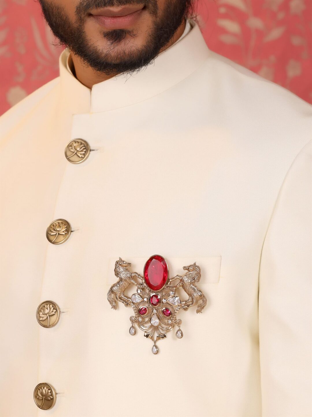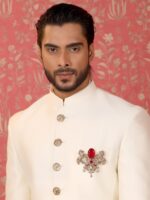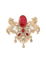 The “Roshan-e-Sawaar Brooch” is an enchanting ode to untamed beauty. This captivating accessory showcases two intricately designed galloping horses, adorned with four stunning green gemstones that exude elegance and vitality. The Glitter Horse Brooch captures the untamed grace and boundless energy of these majestic creatures, empowering every modern individual to embrace their inner strength and free spirit. With its dazzling beauty and symbolic significance, this brooch is the perfect statement piece to add glamour to any outfit.