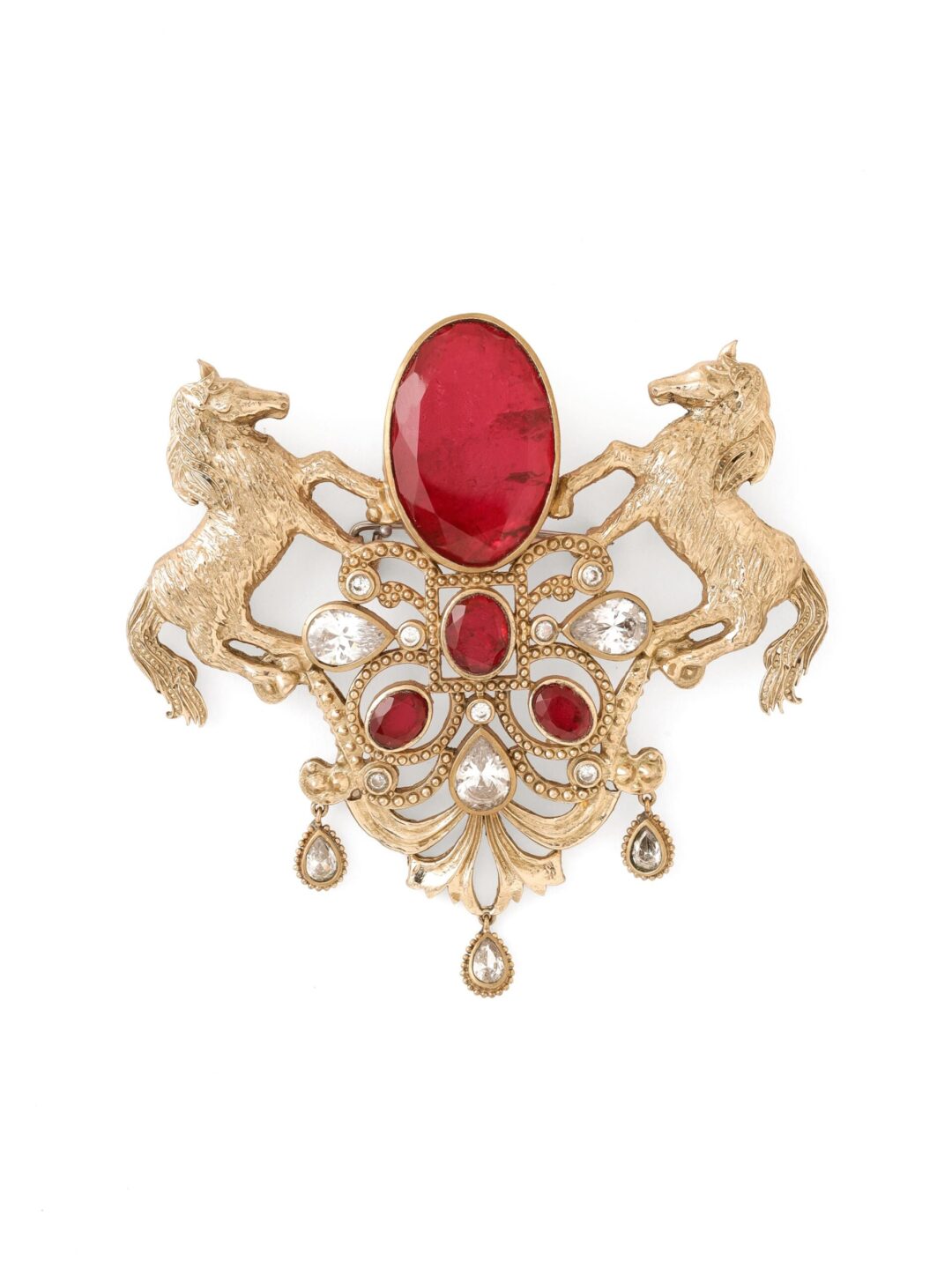 The Brooch design is a reflection of the awe-inspiring allure of horses. The carefully sculpted galloping horses forms capture their innate beauty and spirited freedom. The selection of striking green gemstones mirrors the lush landscapes they roam and represents growth and vitality. Every detail in this brooch is meticulously crafted to embody the mesmerizing energy and enduring grace of horses, making it a cherished emblem of strength and beauty.