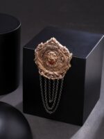 With the blend of gold and copper, this brooch has an aura of majesty and victory. The chain dangles attached to the emblem give it a contemporary touch. It is just the perfect element to complete your look.