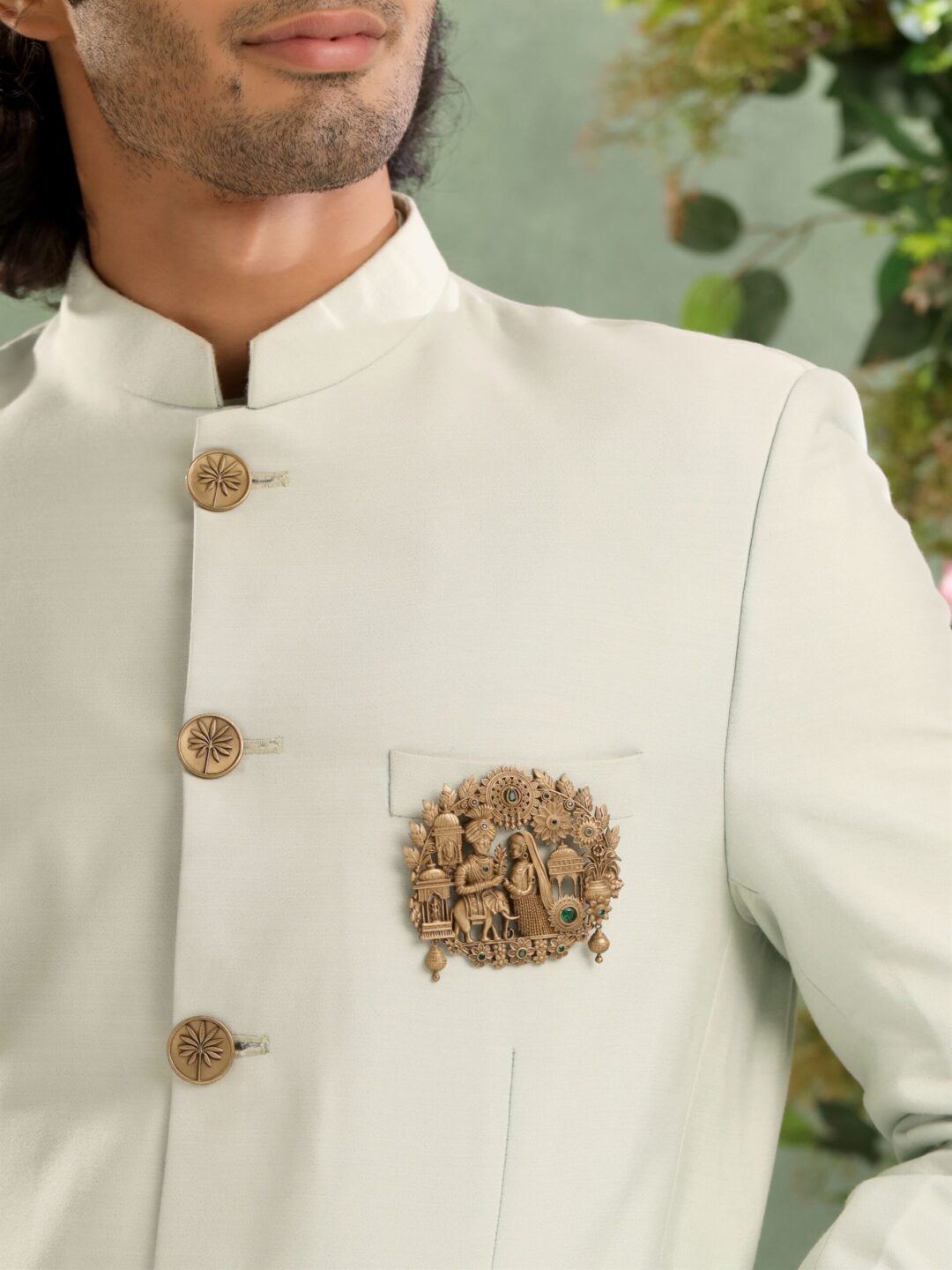 This brooch draws inspiration from the rich heritage of royal Indian weddings and court scenes, representing a timeless celebration of union, grandeur, and cultural elegance. The figures depicted on the brooch are reminiscent of the regal attire and customs seen in traditional Indian ceremonies, with the intricate detailing capturing a glimpse of the vibrant past. The inclusion of the elephant, which has long symbolized strength and prosperity in Indian culture, highlights the historical significance of the motif. The entire design is inspired by the artistry and craftsmanship from classical Indian palaces, where intricate floral patterns and architectural marvels were common.