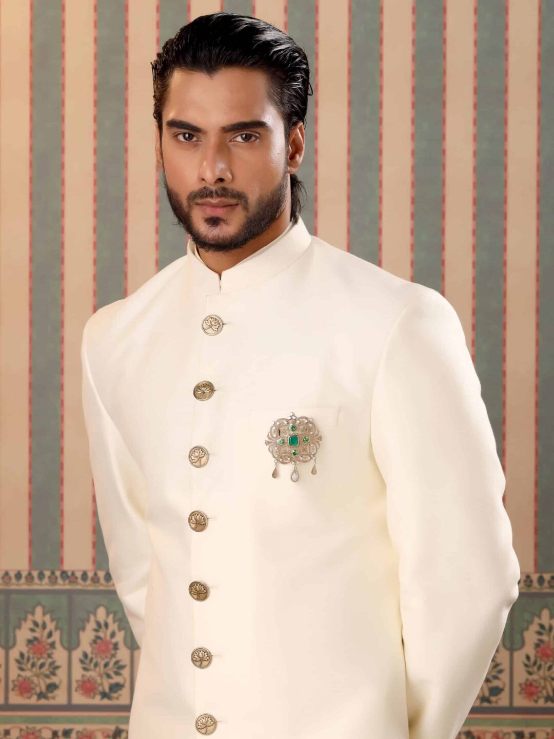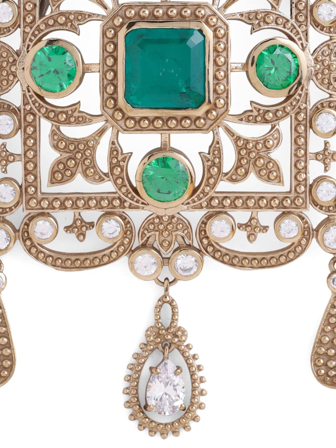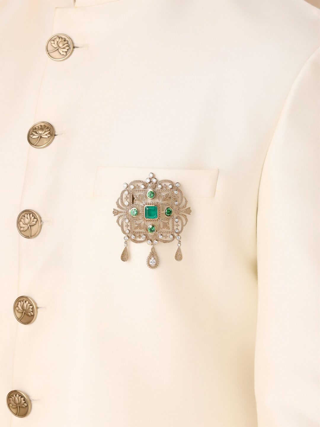 The Brooch design is a celebration of majestic charm and earthy allure. Inspired by royal elegance, the brooch features a majestic big green gemstone at its center. Surrounded by four small green gemstones, it reflects the beauty of nature’s splendor. Adorned with glistening silver stones, it symbolizes a harmonious blend of sophistication and rustic charm. Crafted with artistry, the brooch embodies the wearer’s unique allure, inspired by the regal grace that resides within a down-to-earth essence.