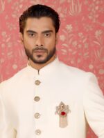 Sawaar-e-Noor is a majestic accessory that embodies the spirit of untamed masculinity and impeccable style. This exquisite brooch features two magnificent stallions designed with a lustrous shimmer that catches every eye in the room. Crafted with attention to detail and adorned with glistening crystals, it exudes a captivating charm that sets you apart from the herd. Whether you’re dressed for a formal occasion or adding flair to everyday wear, this brooch is the epitome of bold elegance for the modern Stallion.