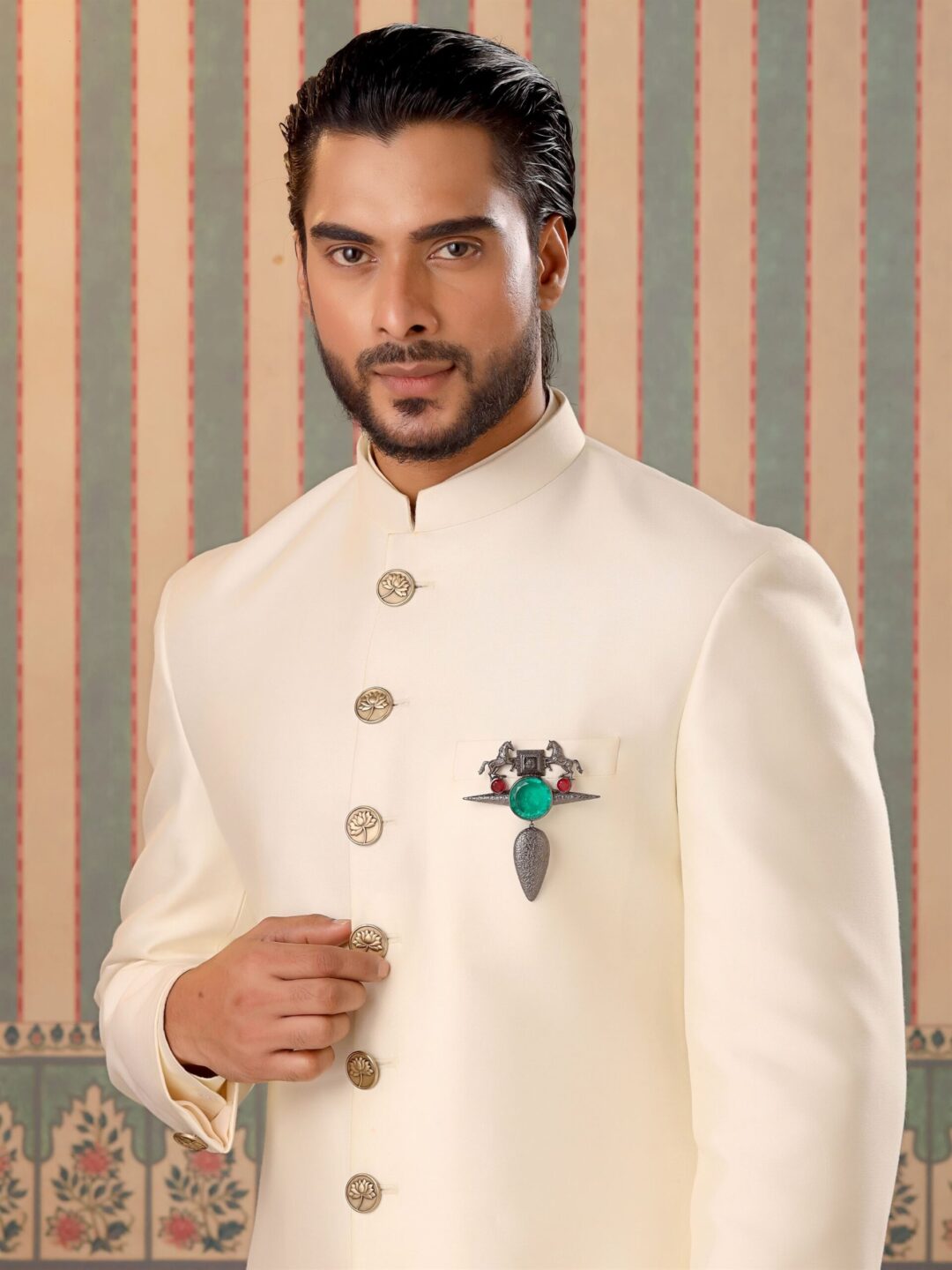 Elevate your style with the “Sawaar-e-Shaan Brooch,” a graceful tribute to the spirit of horses. This exquisite accessory showcases two intricately designed horses, capturing their elegant form and boundless energy. Adorned with two small red gemstones representing their fiery spirit, it exudes a captivating charm. At the heart of the brooch lies a magnificent green gemstone, symbolizing the lush landscapes they gallop through.