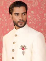 Elevate your style with the “Sawaar-e-Shaan Brooch,” a graceful tribute to the spirit of horses. This exquisite accessory showcases two intricately designed horses, capturing their elegant form and boundless energy. Adorned with two small red gemstones representing their fiery spirit, it exudes a captivating charm. At the heart of the brooch lies a magnificent green gemstone, symbolizing the lush landscapes they gallop through.