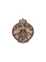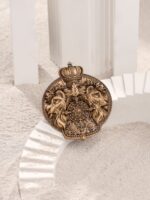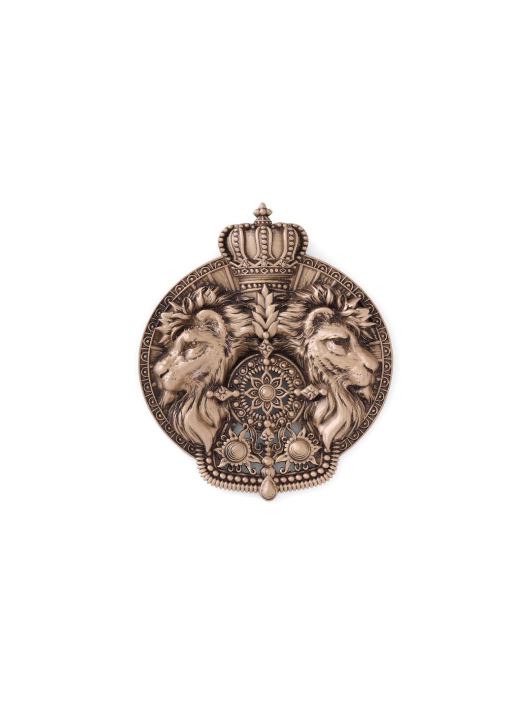 The brooch is a masterpiece of craftsmanship. The lions are portrayed with lifelike precision, their eyes reflecting an intense gaze. The crown is embellished with beautiful patterns, adding a royal touch. The circular frame is adorned with elaborate designs that enhance the overall grandeur of the piece.