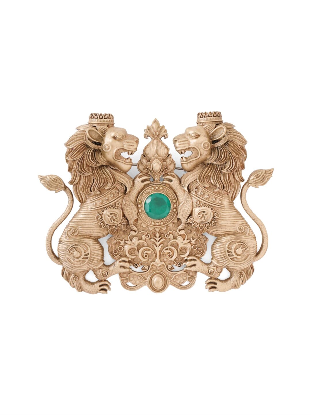 This brooch draws heavily from the historic and cultural significance of guardian lions, often seen in various civilizations as protectors of sacred spaces, royal grounds, and symbols of sovereignty. In particular, the motif is inspired by the lion imagery used in South Asian and ancient European traditions, where lions were depicted as guardians, strength incarnate, and keepers of power. The two lions facing each other, often referred to as “Heraldic Lions,” are a nod to traditional emblems of strength and unity, while the ornamental flourishes evoke the grandeur of ancient palaces and temples. The green gemstone in the center enhances the piece?s regal tone, often associated with fertility, protection, and divine favor in historical contexts.