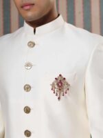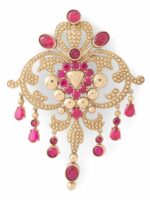 The design of the Victorian Vogue Brooch is a harmonious fusion of Victorian opulence and modern charm. The brooch features intricate patterns and ornate flourishes reminiscent of antique accessories, capturing the essence of the Victorian era’s refined taste. Pink studs and delicate danglers add a touch of vibrancy and movement to the design. Each element of this brooch is crafted to ensure a balanced and captivating design. The choice of materials and the arrangement of elements have been carefully considered to capture the essence of Victorian aesthetics while embracing the playfulness of pink studs and danglers.