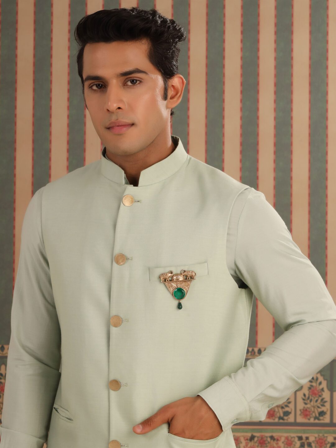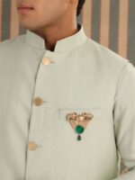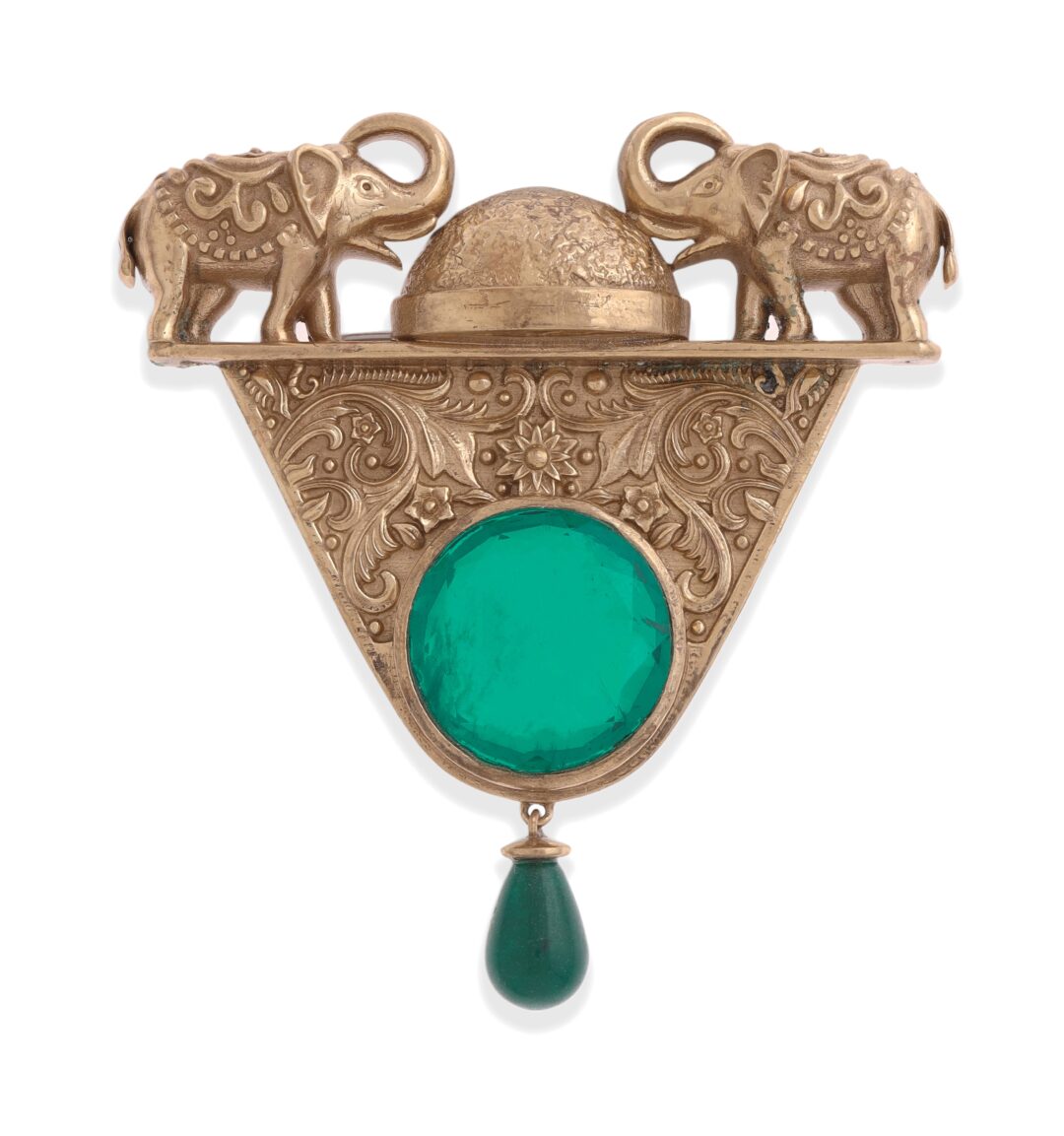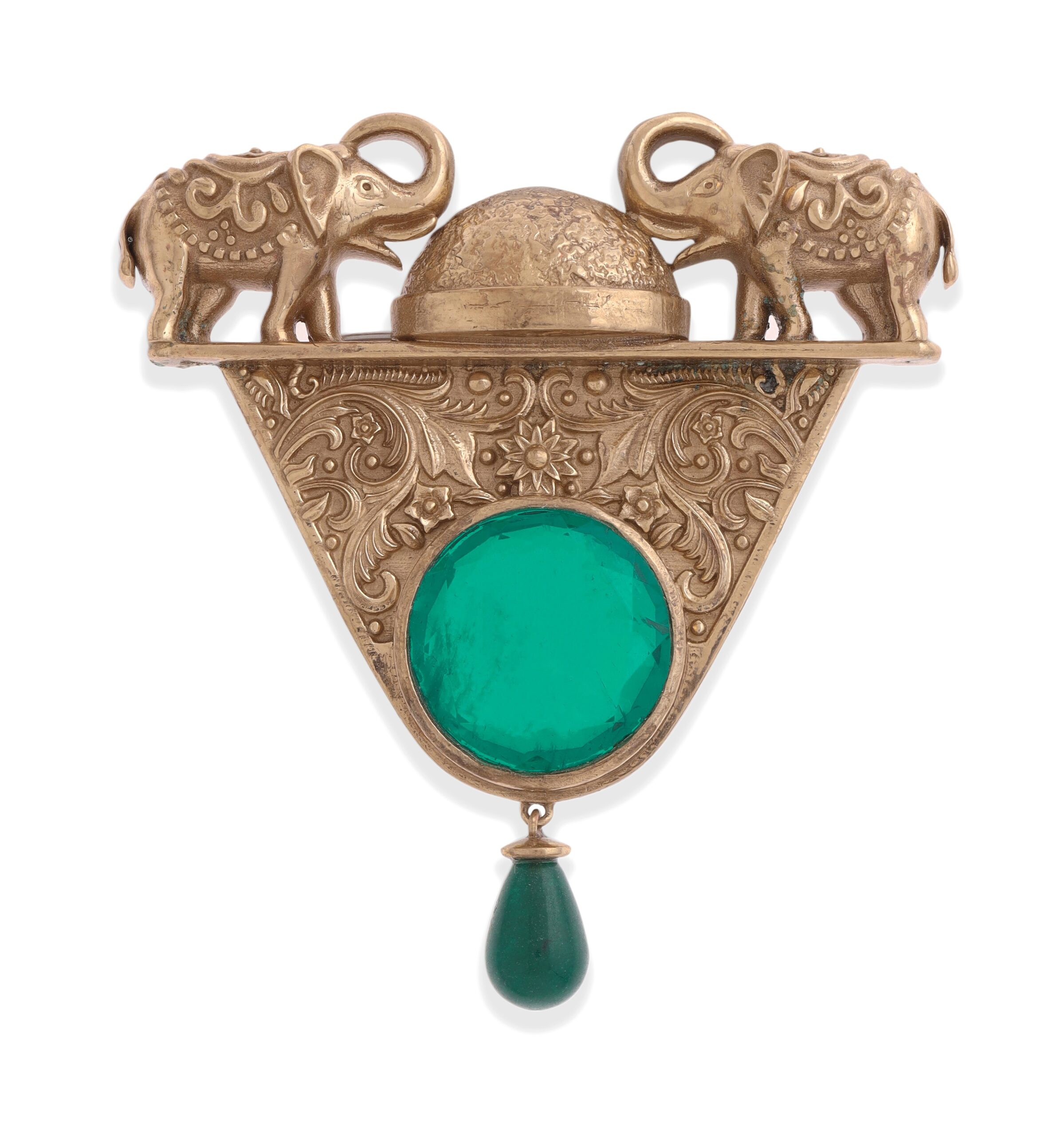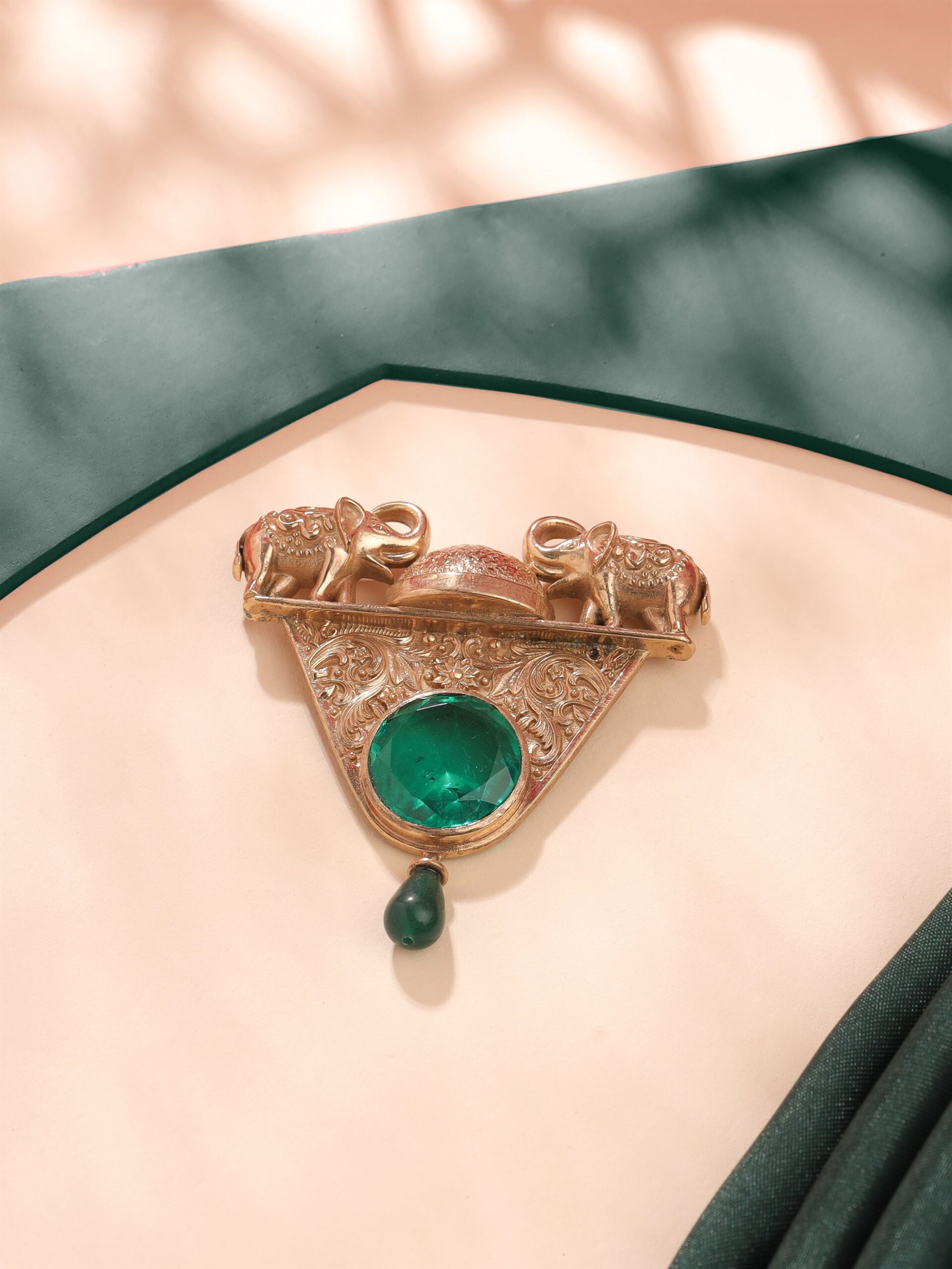 Make a bold statement with this exquisite antique-inspired brooch, featuring two intricately detailed elephants flanking a domed centerpiece. Crafted in a rich gold-tone finish, the triangular design is adorned with ornate floral engravings and a striking emerald green cabochon at its center, complemented by a matching teardrop dangle. A unique and elegant accessory, perfect for adding vintage charm and symbolic sophistication to any outfit.