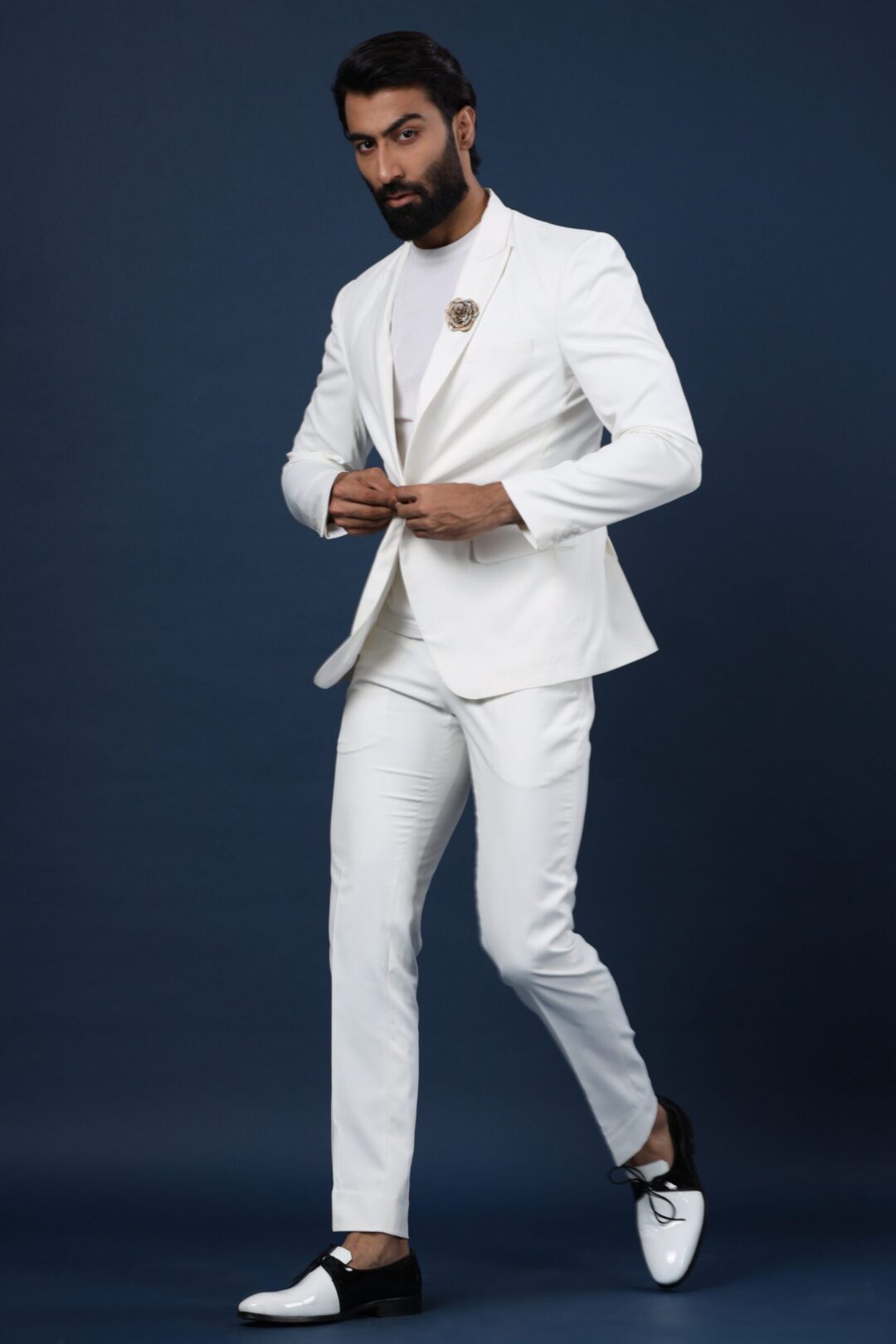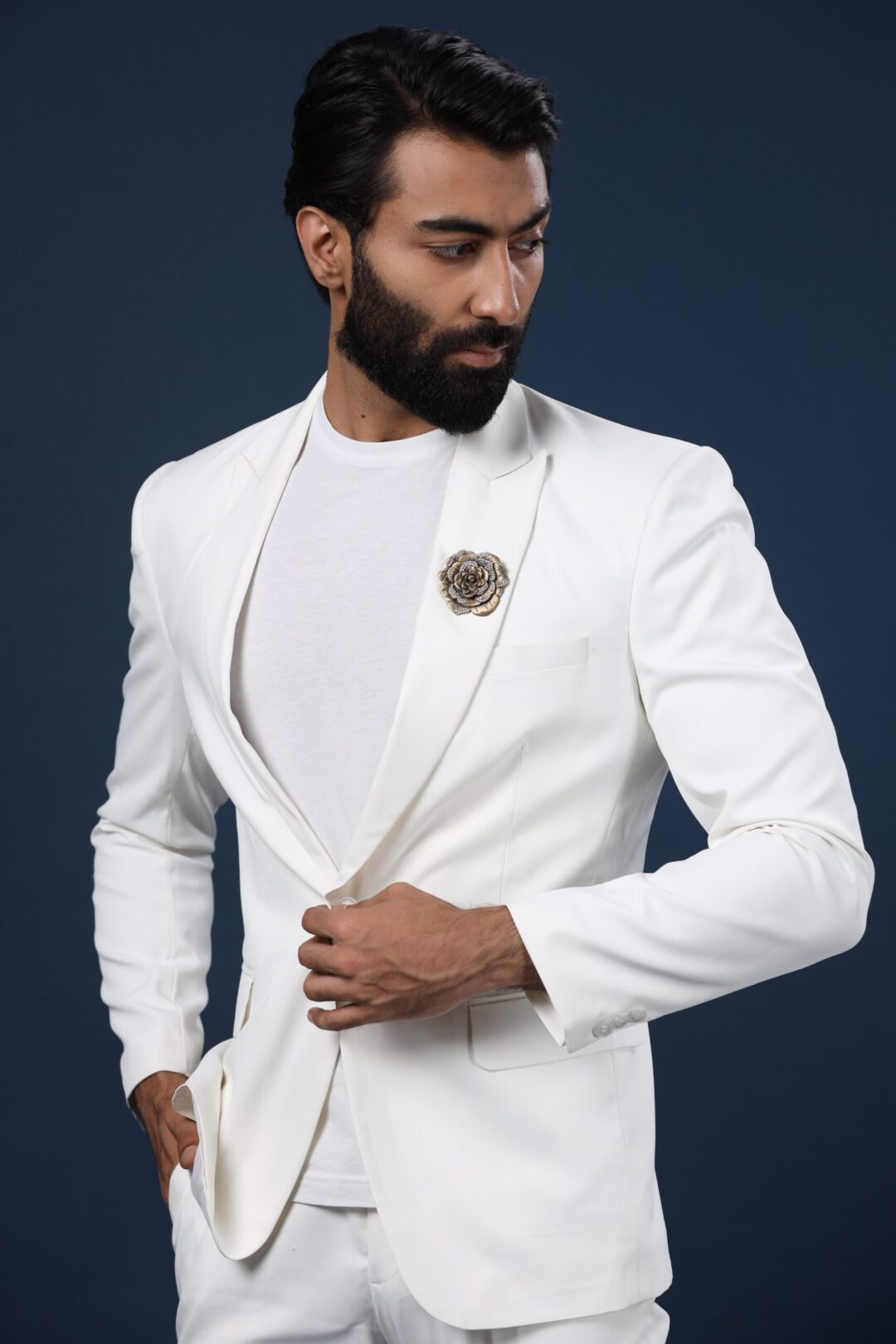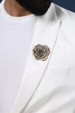 Antonio jacket is a proof of Cosa Nostraa’s dedication to providing the clients with the best quality, timeless fashion apparel. This jacket is an off-white piece of beauty topped with the Regal Rose brooch. The shawl lapel collars of these majestic weaves are something that will add charm to your look.