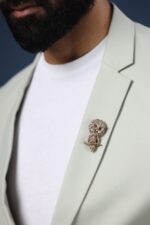 The green-grey Caspian jacket is a style statement apparel. The spread collar and the finishing cut give this jacket a dapper look. When paired with the Hooter brooch, this becomes a must-have occasion wear.