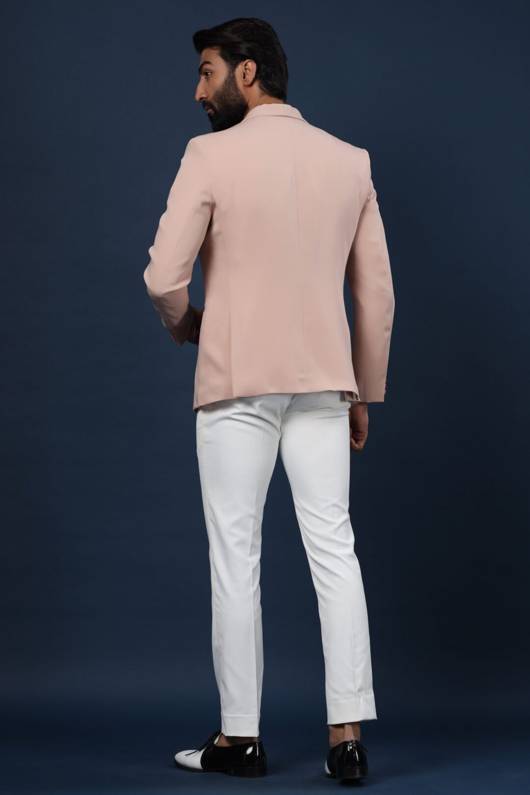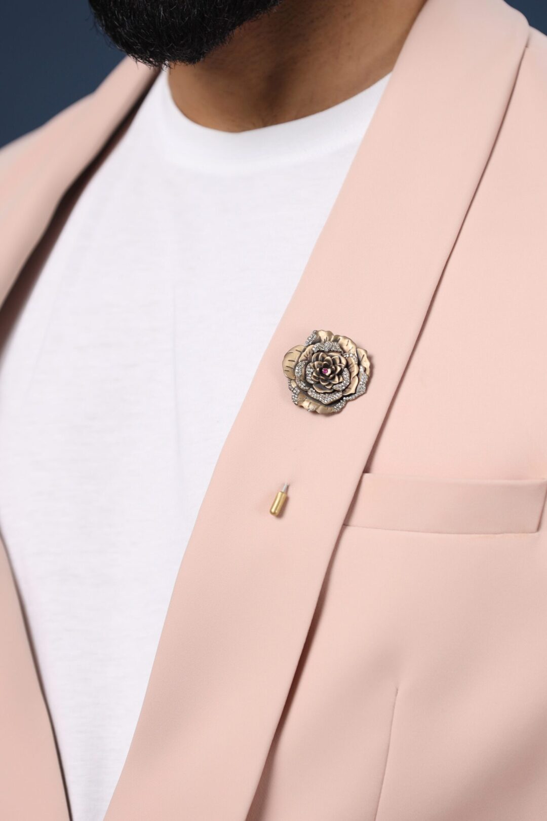 The Philip jacket possessing shawl collars is an example of delicate and perfect craftsmanship. This jacket is a peachish beige-colored apparel that when paired with the Regal Rose lapel pin, gives a charming vibe.