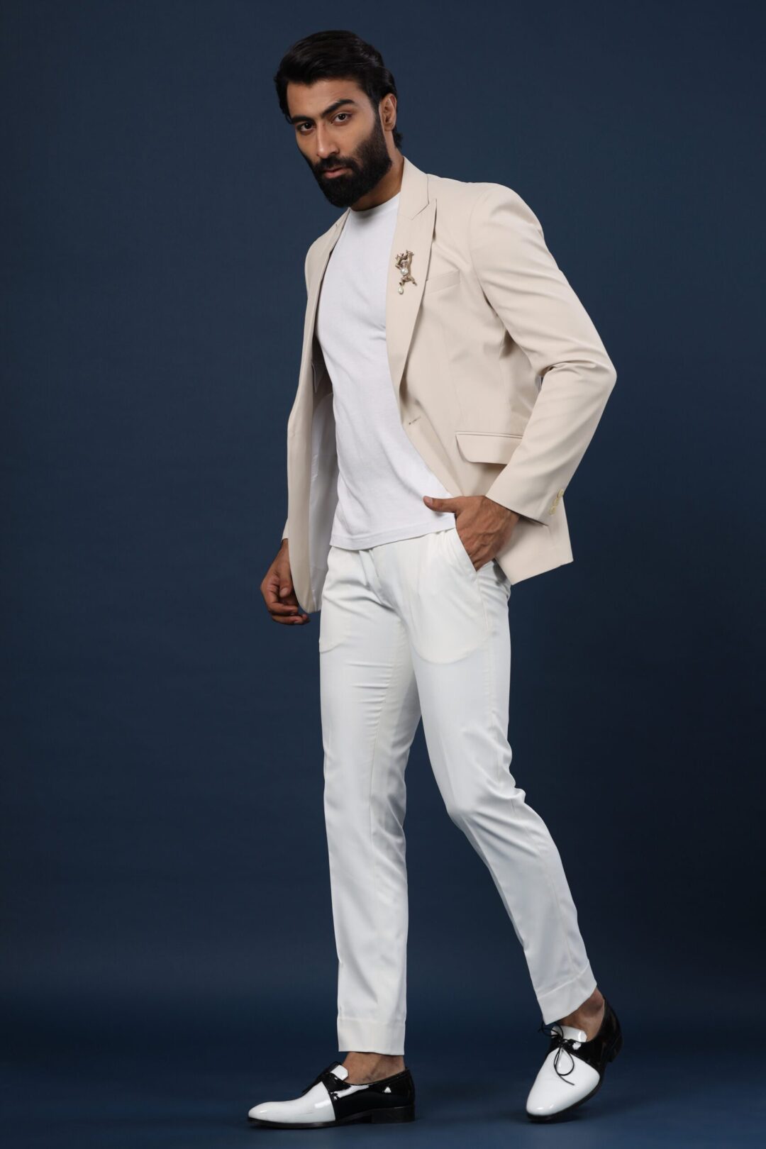 Painted with the lightest shade of beige, the Roy jacket is one of the must-have apparels that can be donned at a party. The fancy jacket topped with a peak collar is sure to add glory to anyone who wears it when topped with the Pearl Monkey brooch.