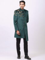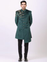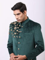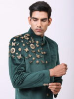Woven with threads of precision and style, the Cosa Nostraa bandhgala with tilted hem becomes the ultimate party wear. Made of high-quality velvet, this bandhgala defines the shine that your personality emits are you enter a room!