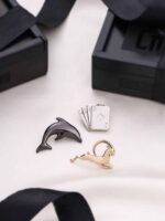 The gentle grace of the deer converges with the whimsy of cards and the fluid elegance of the dolphin. The Deer brooch captures the playful dance of nature, a reminder to find joy in the simplest of movements. The Cards brooch, with its playful arrangement, embodies the unpredictability of life, urging wearers to play their cards with a light heart. The Dolphin brooch, with its dynamic form, reflects the playful spirit of the ocean, inviting wearers to dive into the delightful waves of life.