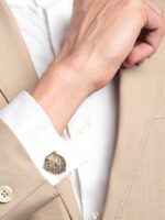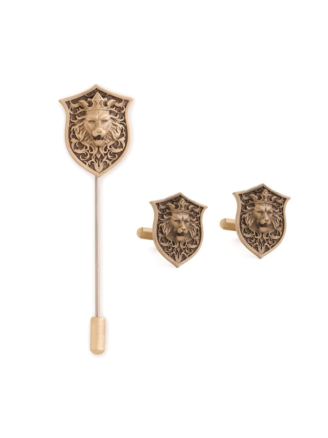 A majestic ensemble crafted from fine brass, exuding regal elegance and strength. This distinguished gift set features a stunning lion motif adorning a shield-shaped brass lapel pin, symbolizing courage and leadership. Paired with it is a matching brass cufflink set, meticulously designed to complement any attire with its exquisite detailing. Perfect for those who appreciate timeless sophistication and bold flair, It is an ideal choice for adding a touch of noble charm to any occasion. Present this remarkable set to someone special, and let them embrace the spirit of the lion ? fearless, majestic, and undeniably captivating.