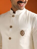 Crafted in antique gold?finished metal, the brooch highlights a Rudraksha bead at the center, while the lapel pin carries a Shiv-inspired emblem with detailed carvings.