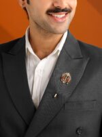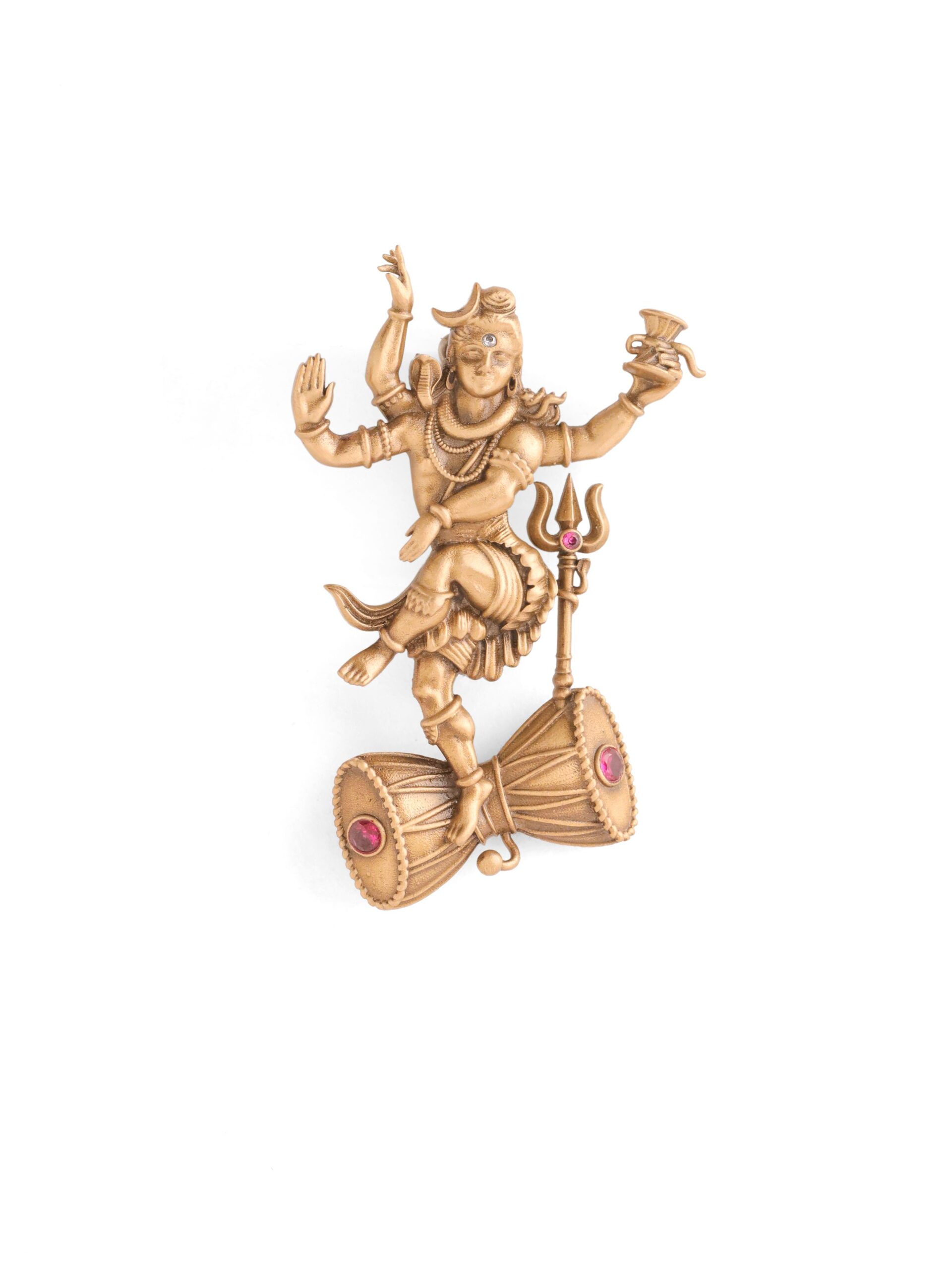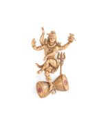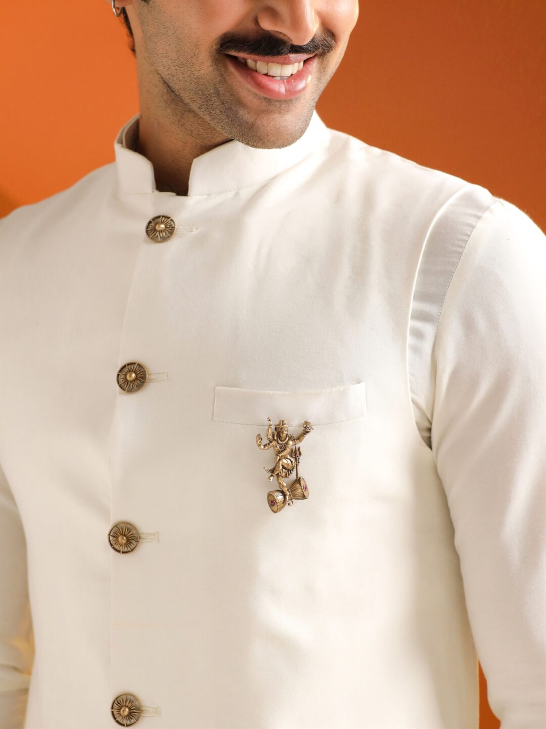Crafted in antique gold?finished metal, the brooches highlights Lord Shiva in a powerful Tandav form alongside Nandi, while the lapel pin showcases an ornate Trishul motif with Rudraksha accents.