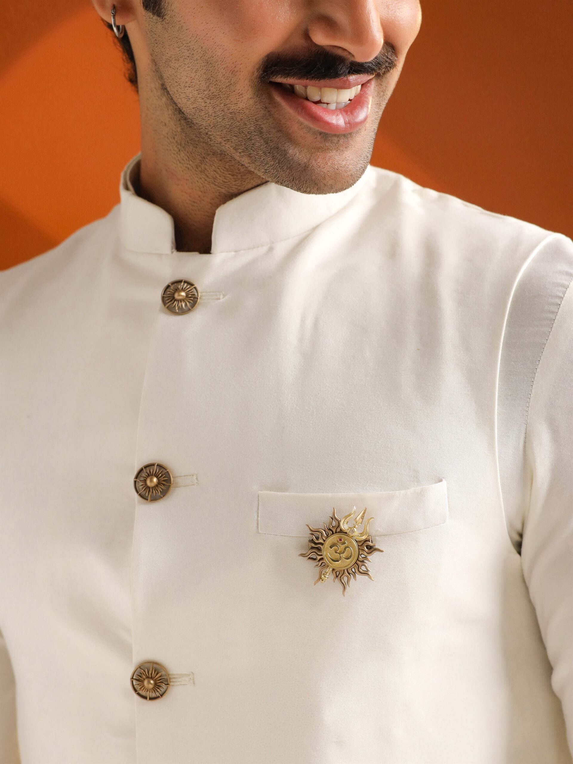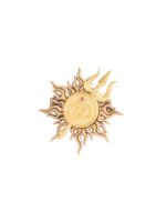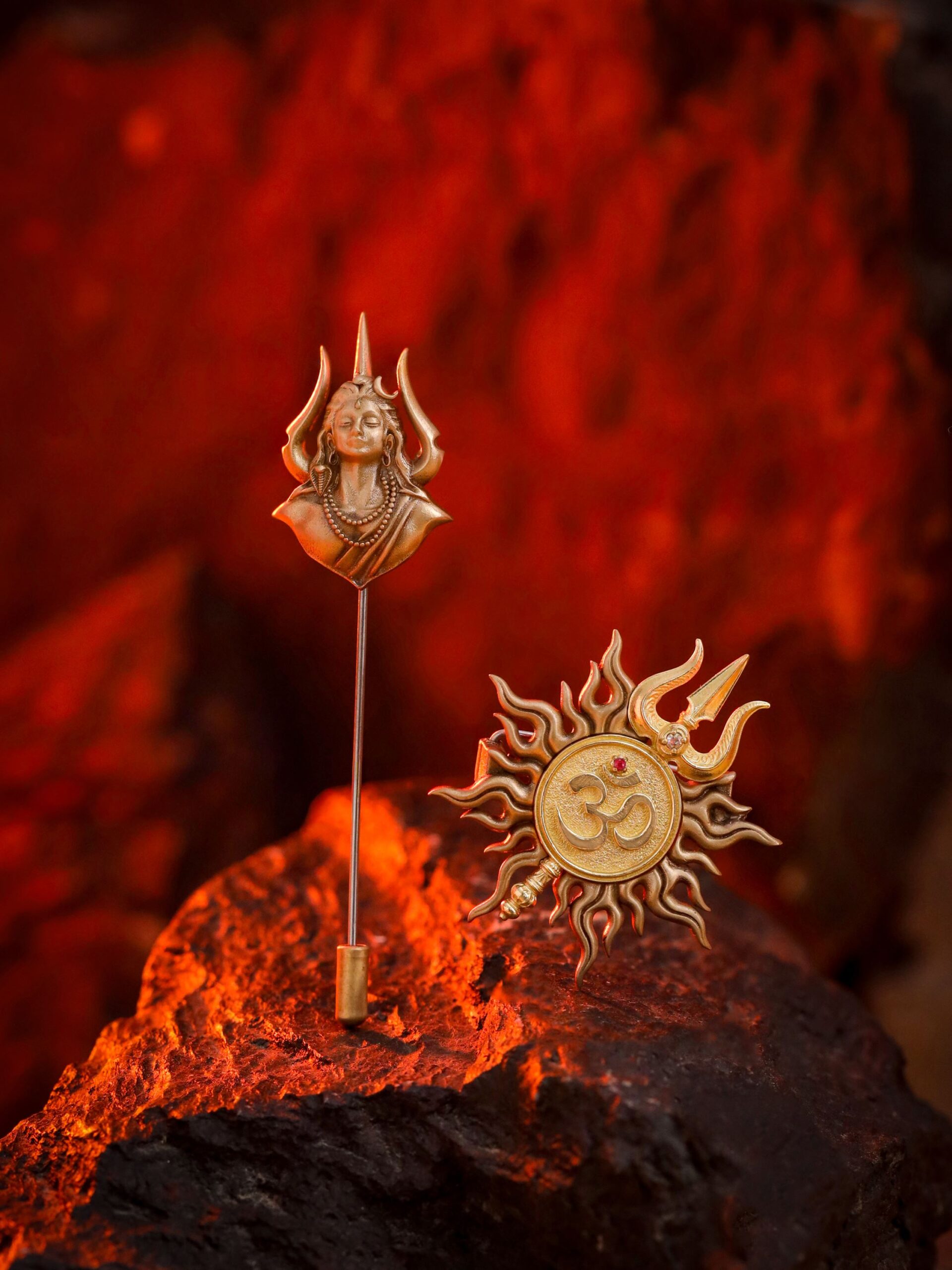 Crafted in antique gold finished metal, the brooch showcases the sacred Om within a radiant sun form, while the lapel pin carries a serene Shiv with fine detailing.
