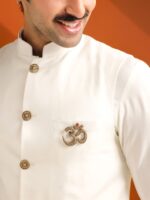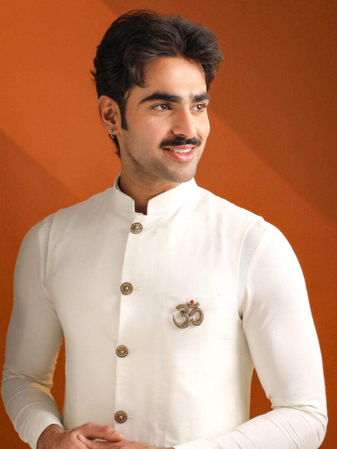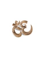 A refined men?s brooch featuring the sacred Om symbol, representing harmony, creation, and inner strength. Crafted in antique gold tones with intricate floral engravings and a Rudraksha accent, this piece adds spiritual elegance to sherwani, bandh gala, and classic menswear.