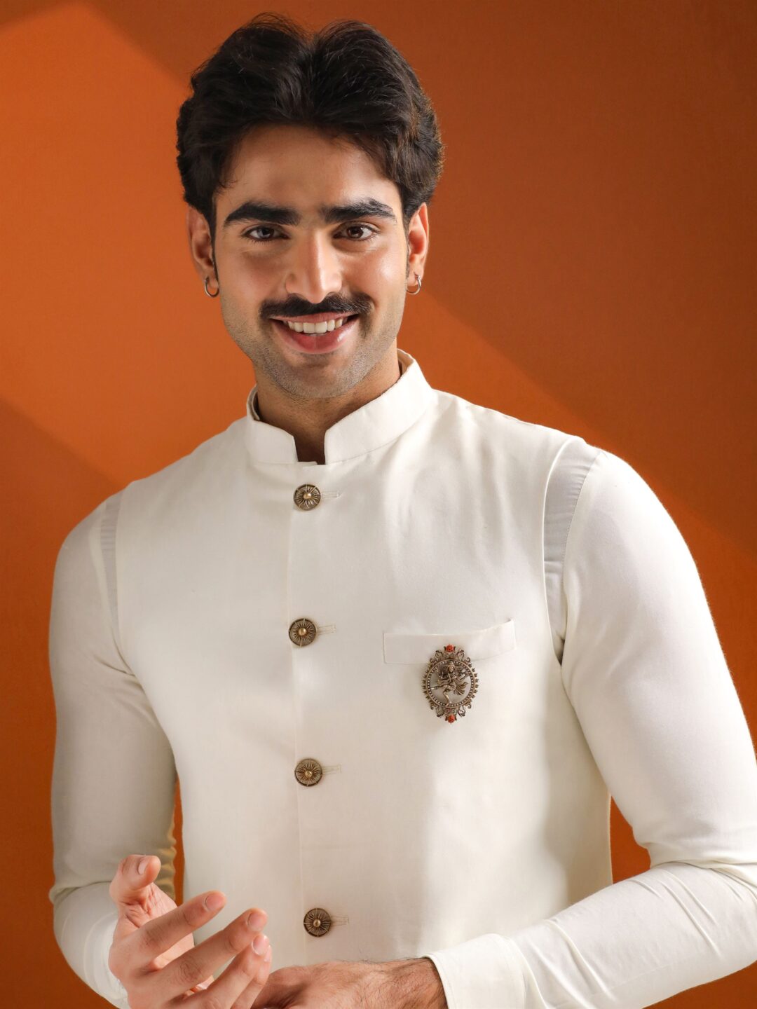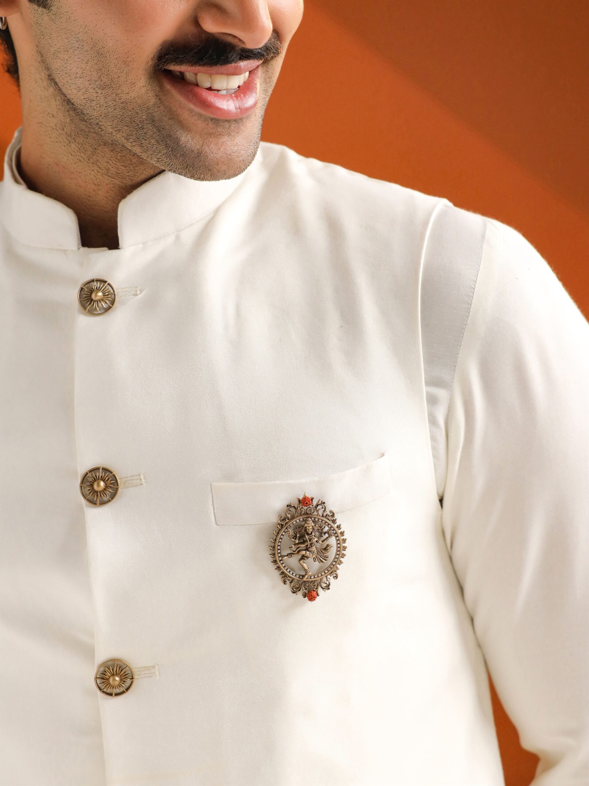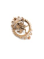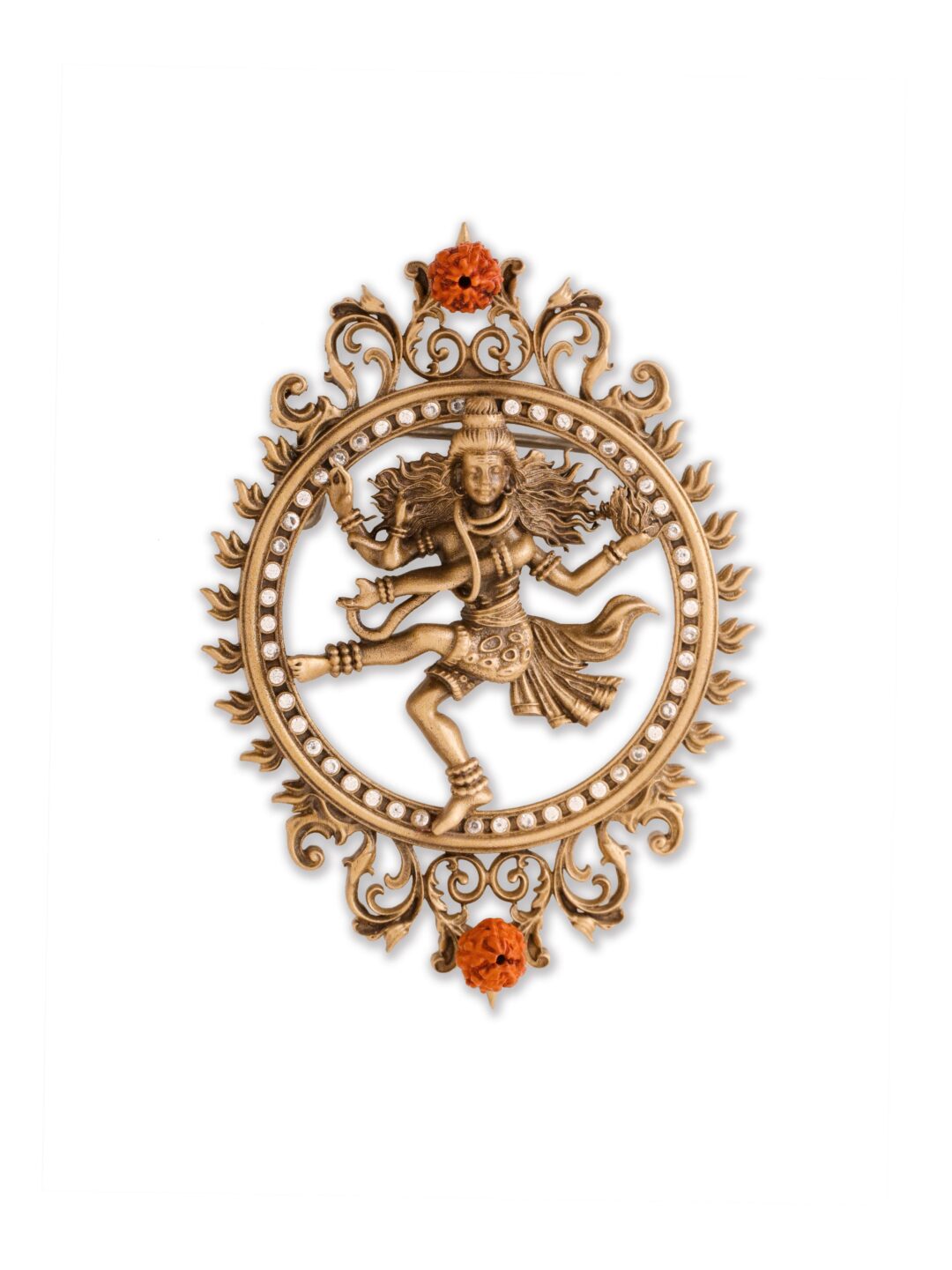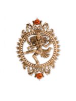 A majestic men?s brooch inspired by Lord Shiva as Nataraj, symbolizing cosmic rhythm, creation, and balance. Crafted in antique gold tones with intricate detailing, crystal-ring accents, and Rudraksha highlights, this piece brings spiritual power and royal elegance to sherwani, bandh gala, and ceremonial attire.