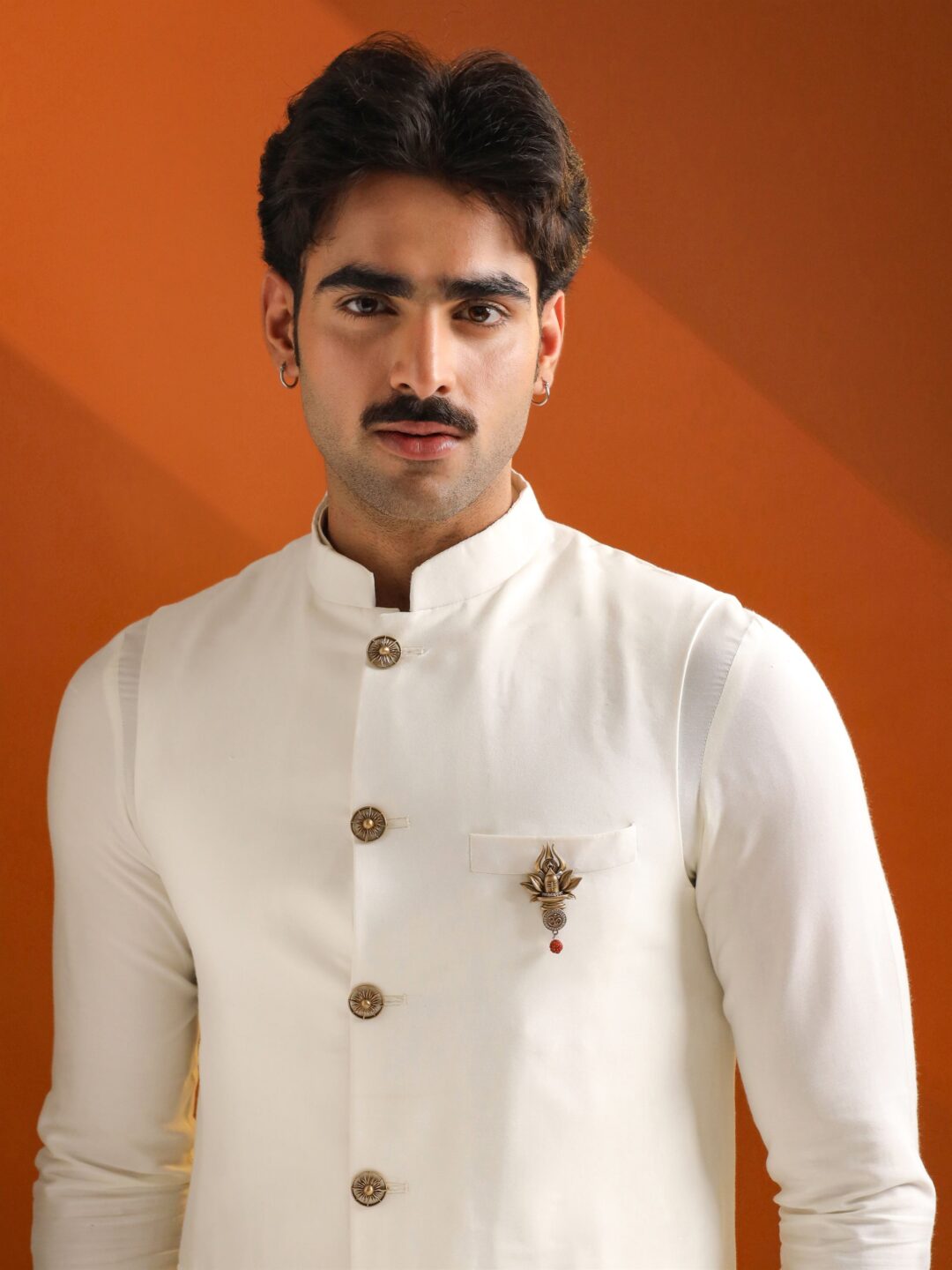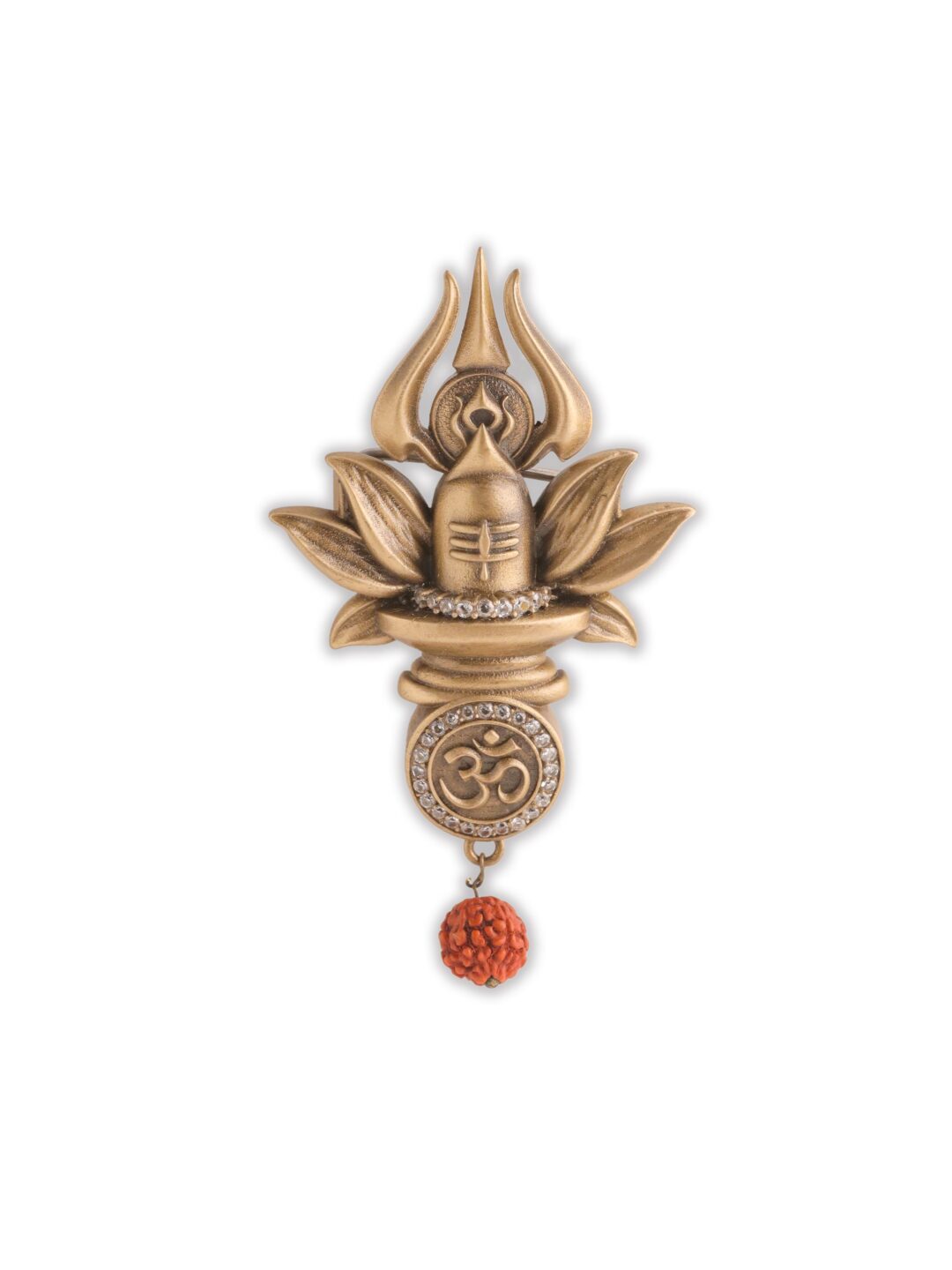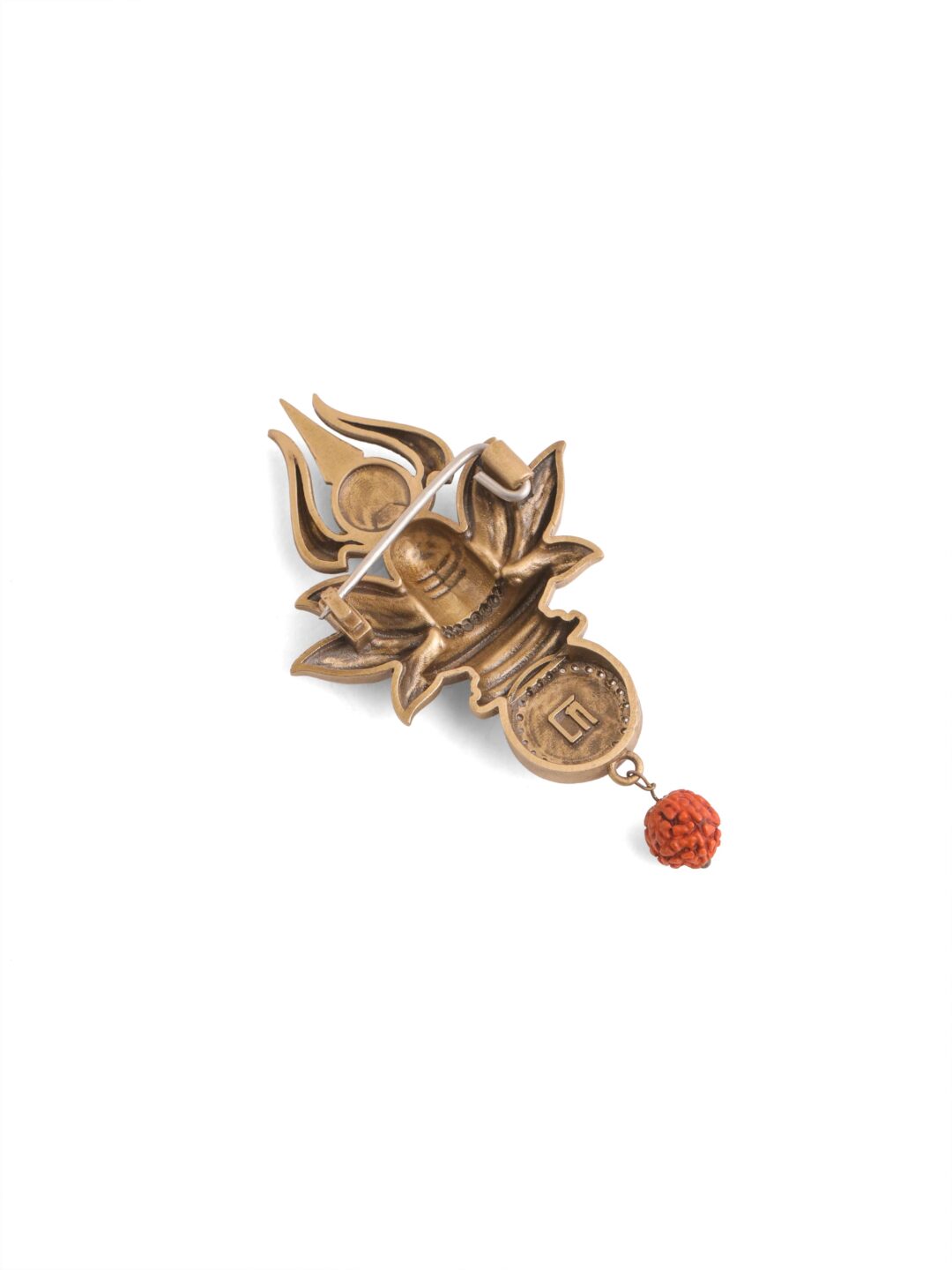 A commanding men?s brooch inspired by Lord Shiva, featuring a sacred Shivling crowned with the Trishul and lotus accents, finished with an Om medallion and Rudraksha drop. Crafted in antique gold tones with crystal detailing, it symbolizes strength, balance, and divine protection.