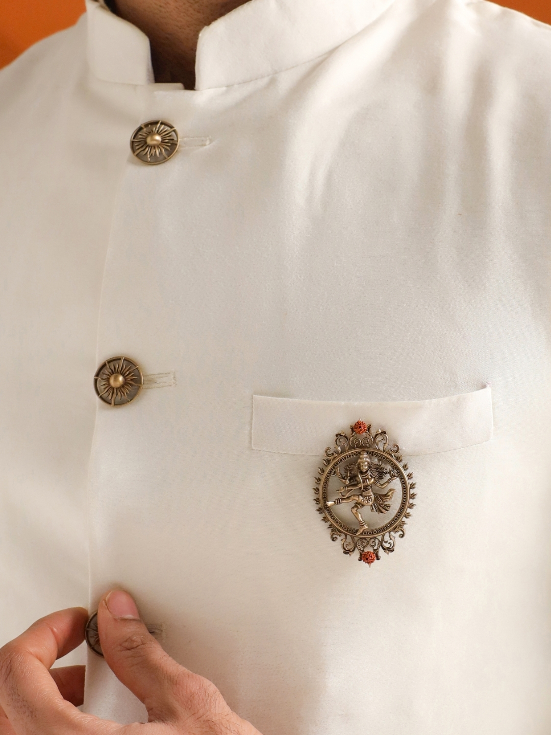 A majestic men?s brooch inspired by Lord Shiva as Nataraj, symbolizing cosmic rhythm, creation, and balance. Crafted in antique gold tones with intricate sculpted detailing, ornate circular framing, and Rudraksha accents, this piece adds powerful spiritual elegance to sherwani, bandh gala, and ceremonial attire.