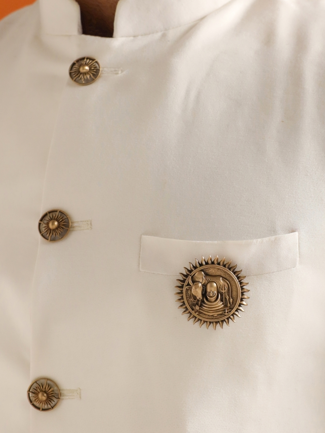 A powerful men?s brooch inspired by Lord Shiva, featuring the sacred Shivling, Nandi, and Trishul within a radiant sun motif. Crafted in antique gold tones with intricate detailing, this emblem symbolizes devotion, strength, and protection?ideal for sherwani, bandh gala, and ceremonial wear.