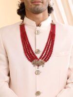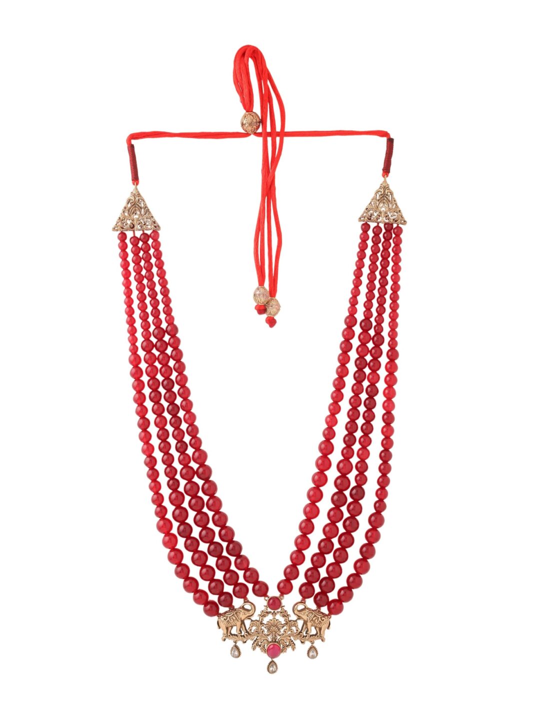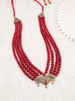 The Elephant Red Mala features a pair of charming elephants adorned with two red gemstones. The elephants are crafted with a graceful design, and the mala serves as an elegant accessory suitable for various attires.