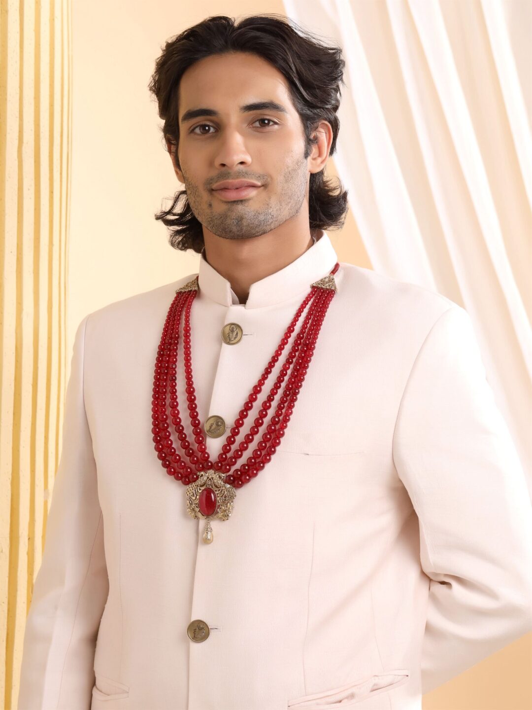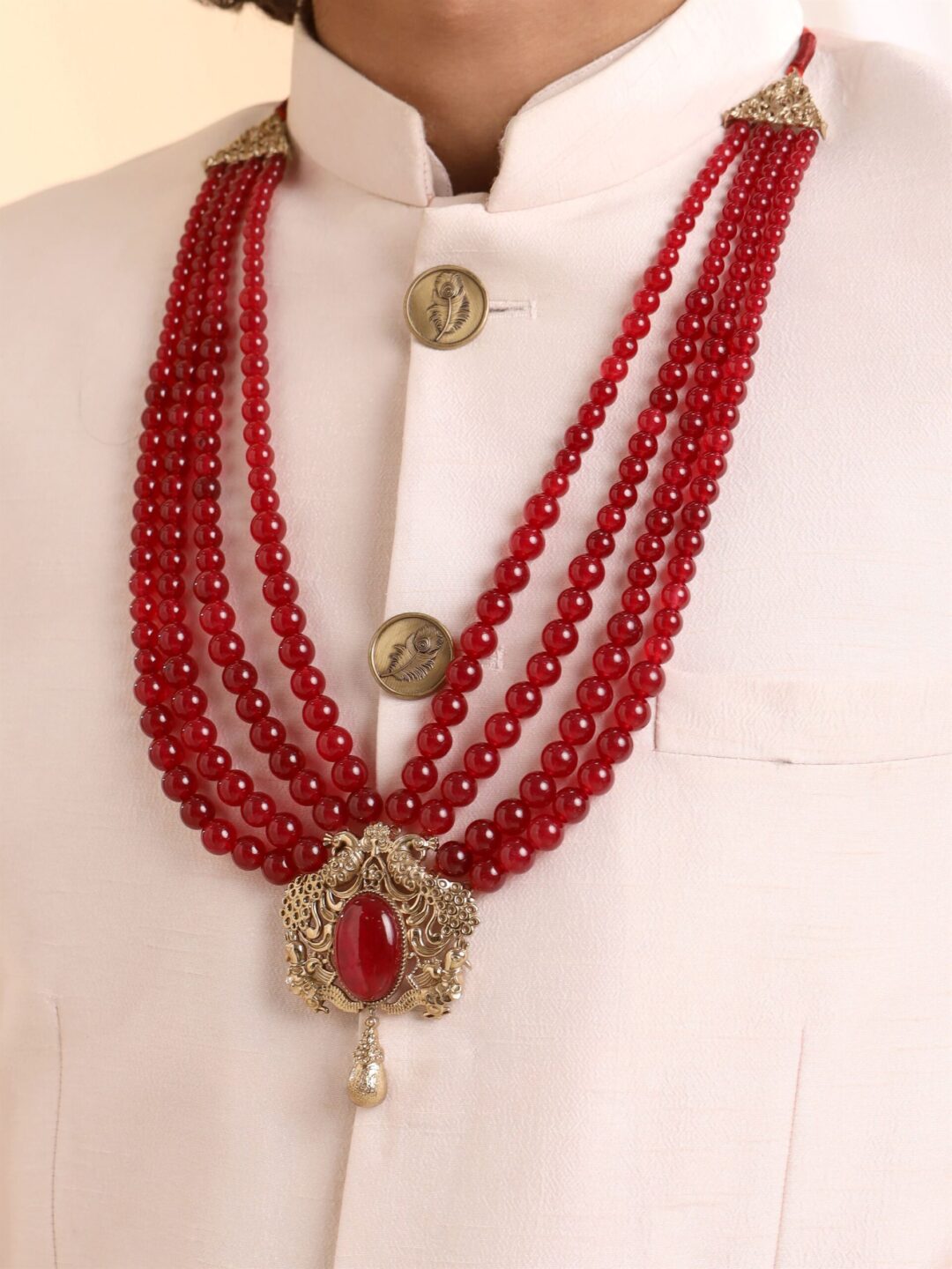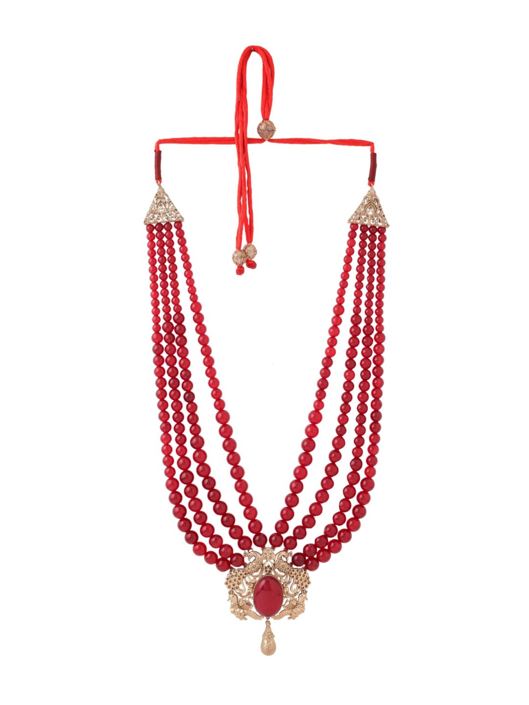 The Peacock Red Mala features two peacocks and a striking green gemstone. Its design highlights fine detailing, offering a versatile accent that effortlessly complements your attire.