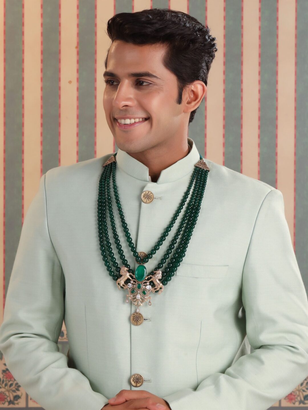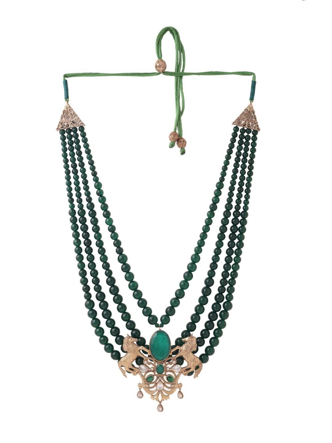 The green beads, interspersed with golden stallion motifs, creates a visual symphony that mirrors the dynamic beauty of nature. The golden stallions, with their graceful form, add a touch of regality to the mala, elevating it to a symbol of both earthly vigor and noble splendor. The well-balanced design ensures that each element contributes harmoniously to the overall aesthetic.