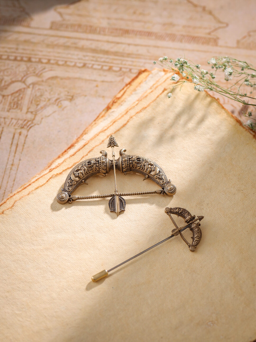 Channel the spirit of a warrior with the Ram Dhanush Gift Set, a masterpiece of craftsmanship inspired by ancient tales of heroism and strength. Featuring a detailed bow and arrow design adorned with ornate motifs, this lightweight brooch & Lapel Pin captures the essence of bravery and precision.Perfect for coats and jackets, it adds a bold, mythic charm to your ensemble, making it a symbol of courage and timeless elegance. Wear it to embody the relentless pursuit of your goals, just as a true archer never misses the mark