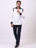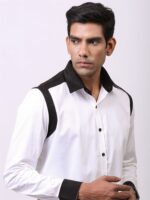 ItīŋŊs ironical but white is a truly ever-green colour! Here we’ve leveled up the basic white shirt with a pseodo semi suspender look derived from the defence uniforms of Russia. White matches well with whichever bottoms & jackets you choose. Adorn a blazer with denim for business casual attire or choose the trousers and be a board-room boss!