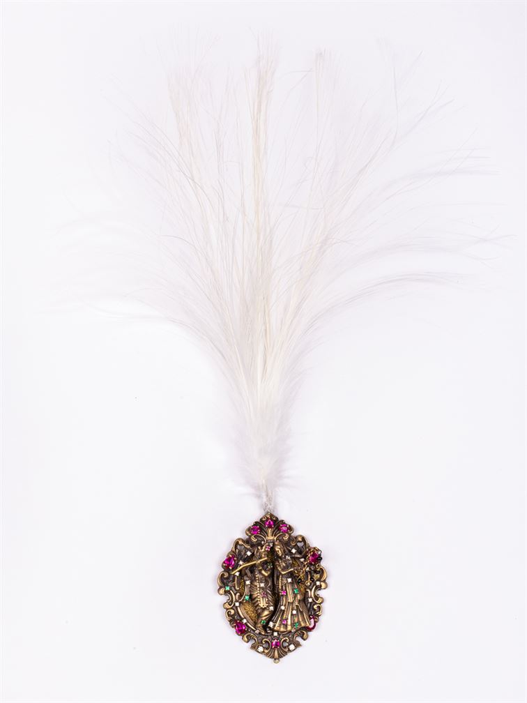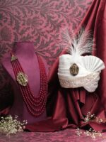 This set features a beautiful motif of Radha Krishna, symbolizing divine strength and blessings.The mala is crafted with layers of deep red beads, paired with a kalangi in antique gold finish.The detailing reflects heritage artistry and traditional elegance.Perfect for weddings, religious ceremonies, and festive occasions.
