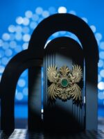 The Emerald Aviary Brooch celebrates regality and freedom with two majestic parrots poised in flight. Crafted in antique gold, the brooch is adorned with an emerald centerpiece and a drop stone, symbolizing prosperity and vitality. The fine detailing of the feathers and ornamental scrollwork enhances its grandeur, making it a statement piece for bandhgalas, sherwanis, or ceremonial attire. A perfect blend of heritage artistry and masculine elegance, this brooch adds a distinguished charm to every Indian wedding or festive occasion.