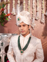 This set highlights a bold emerald stone that brings richness and strength to the design.The mala is strung with deep green beads, while the kalangi is crafted in antique gold with a matching emerald centerpiece.The look is powerful yet royal, making it a perfect choice for weddings, receptions, and grand celebrations.