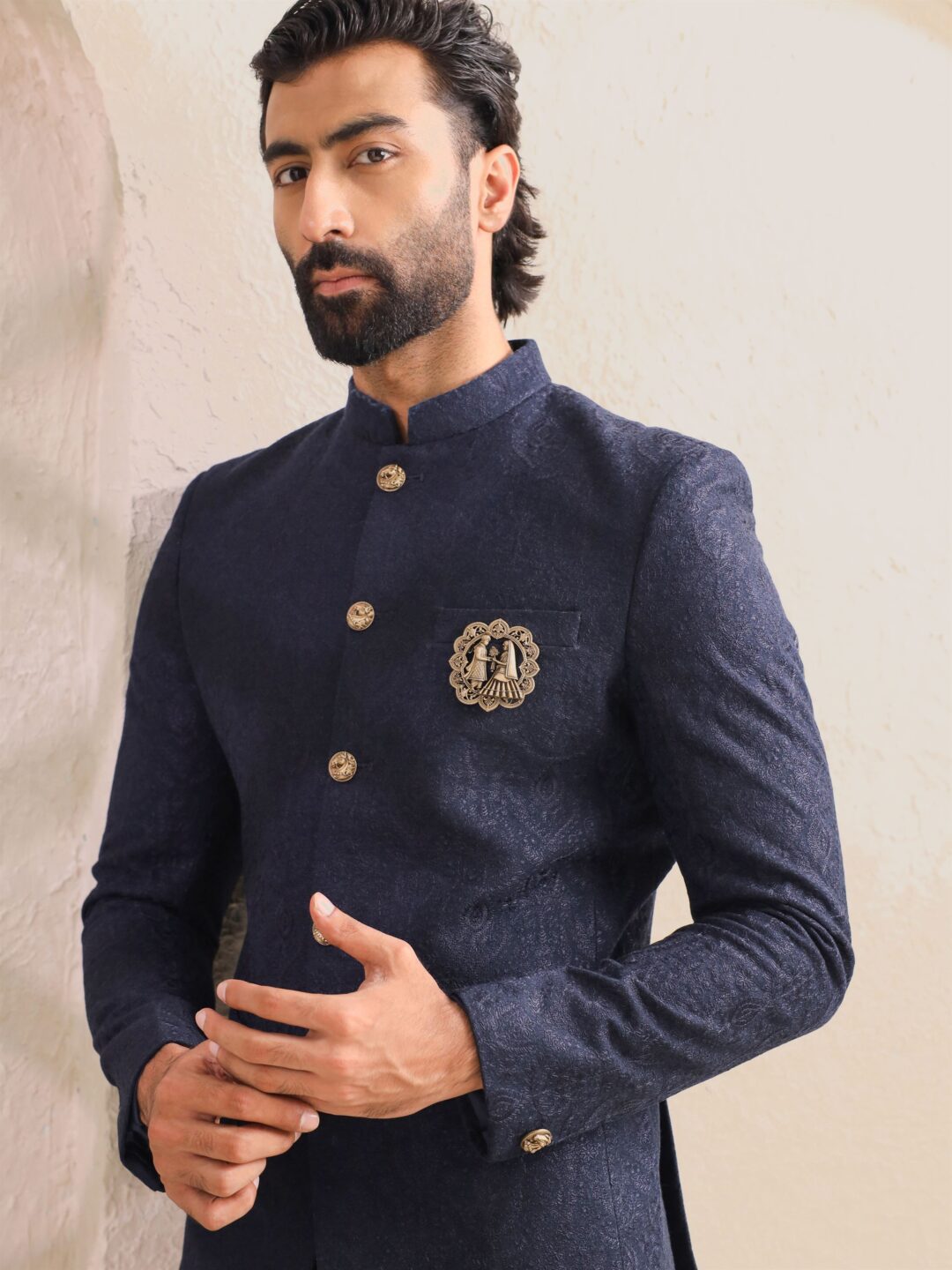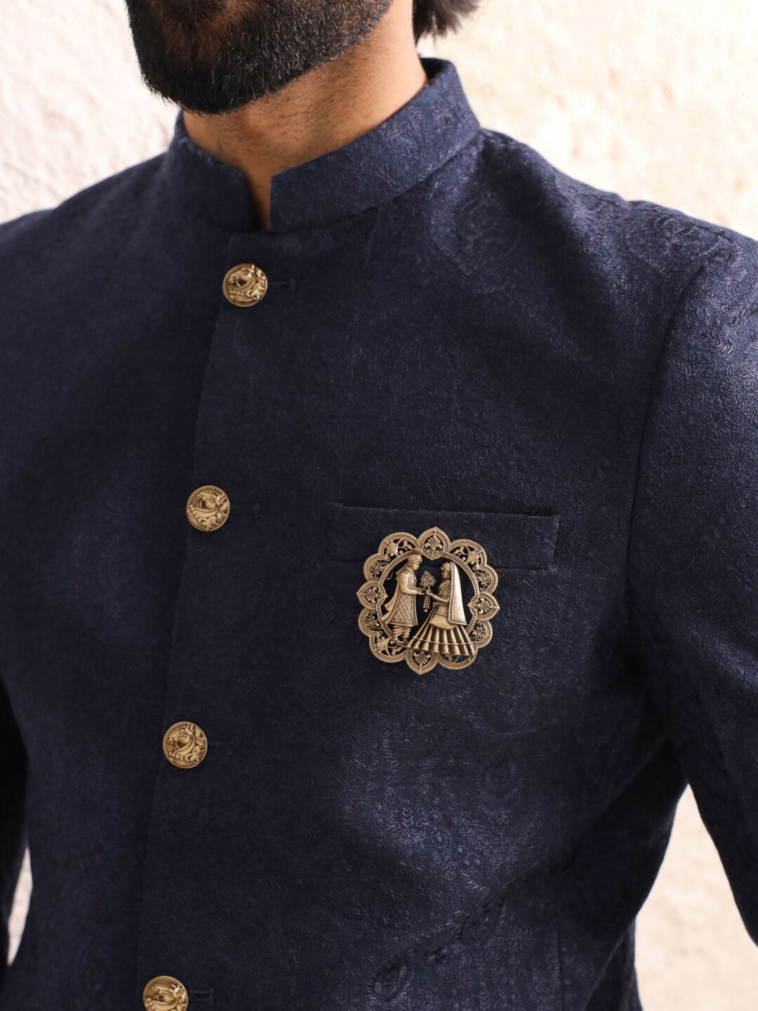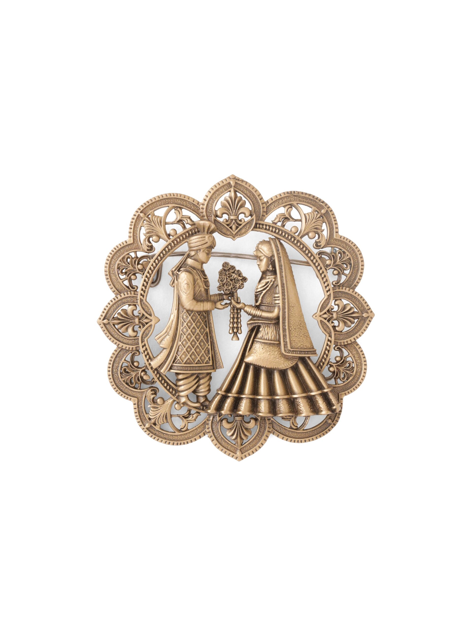 The Eternal Vows Brooch beautifully captures the sacred bond of matrimony. Designed in antique-finished brass, it depicts a groom and bride in traditional attire exchanging flowers, framed within an intricately carved circular motif. Every detail, from the groom?s royal sherwani to the bride?s flowing lehenga, is crafted with precision, symbolizing love, respect, and union. A meaningful accessory for groom or bride family, this brooch adds heritage charm and emotional depth to ceremonial attire, making it a timeless keepsake of tradition and togetherness.