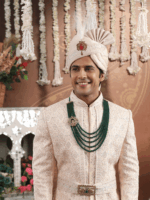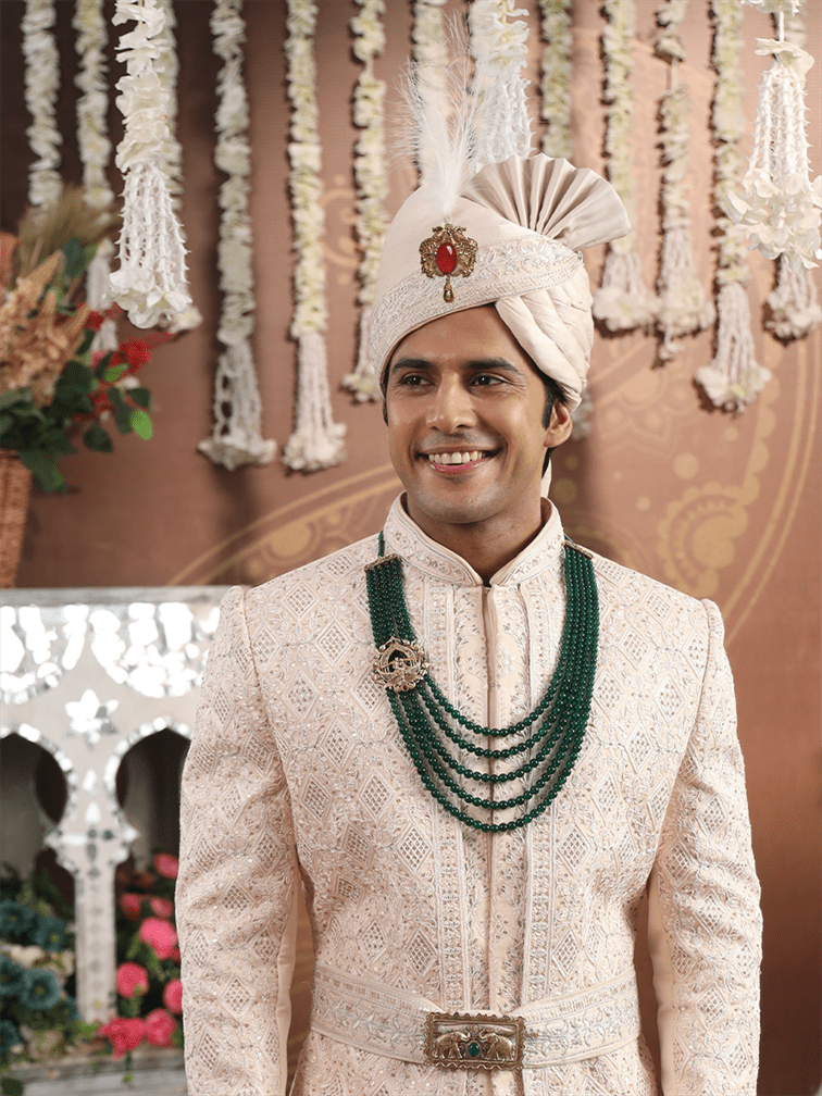 The Imperial Ruby Kalangi is a regal masterpiece crafted for men who embrace heritage with grandeur. Featuring an oval ruby red stone as its centerpiece, the design is flanked by two intricately detailed peacocks in antique gold finish, symbolizing pride and prosperity. The delicate plume of white feathers adds a royal charm, making it an ideal accessory for grooms and ceremonial attire. A timeless fusion of artistry and tradition, this kalangi captures the spirit of majestic Indian royalty.