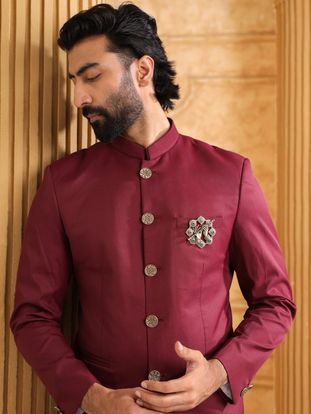 Accented with emerald-green and ruby-red stones, this brooch echoes the splendor of Vrindavan?s timeless melodies. Lightweight and elegant, it makes a perfect adornment for a bandhgala, sherwani, or festive jacket.