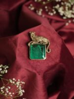 Expertly crafted, the panther is depicted in a relaxed, poised position atop a large green gemstone, symbolizing the creature’s dominance and elegance. The attention to detail in the pantherâs textured fur and its calm yet alert posture showcases exceptional artistry. The vibrant green stone adds a touch of regality and luxury, contrasting beautifully with the golden hues of the panther. This lightweight brooch is a statement accessory, perfect for elevating any formal ensemble, whether on a coat, jacket, or bandhagala.