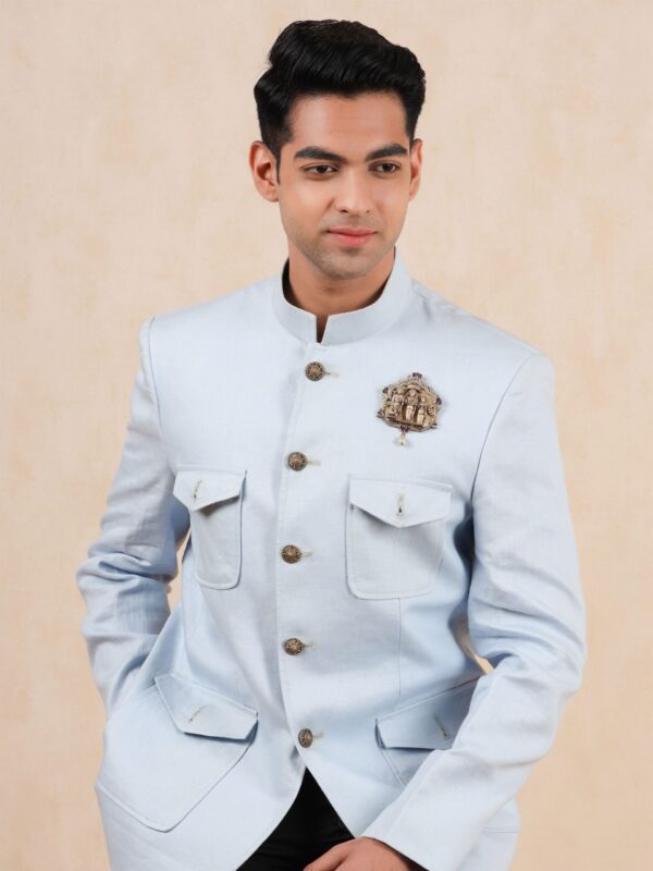 Expertly crafted, the panther is depicted in a relaxed, poised position atop a large green gemstone, symbolizing the creature’s dominance and elegance. The attention to detail in the pantherâs textured fur and its calm yet alert posture showcases exceptional artistry. The vibrant green stone adds a touch of regality and luxury, contrasting beautifully with the golden hues of the panther. This lightweight brooch is a statement accessory, perfect for elevating any formal ensemble, whether on a coat, jacket, or bandhagala.