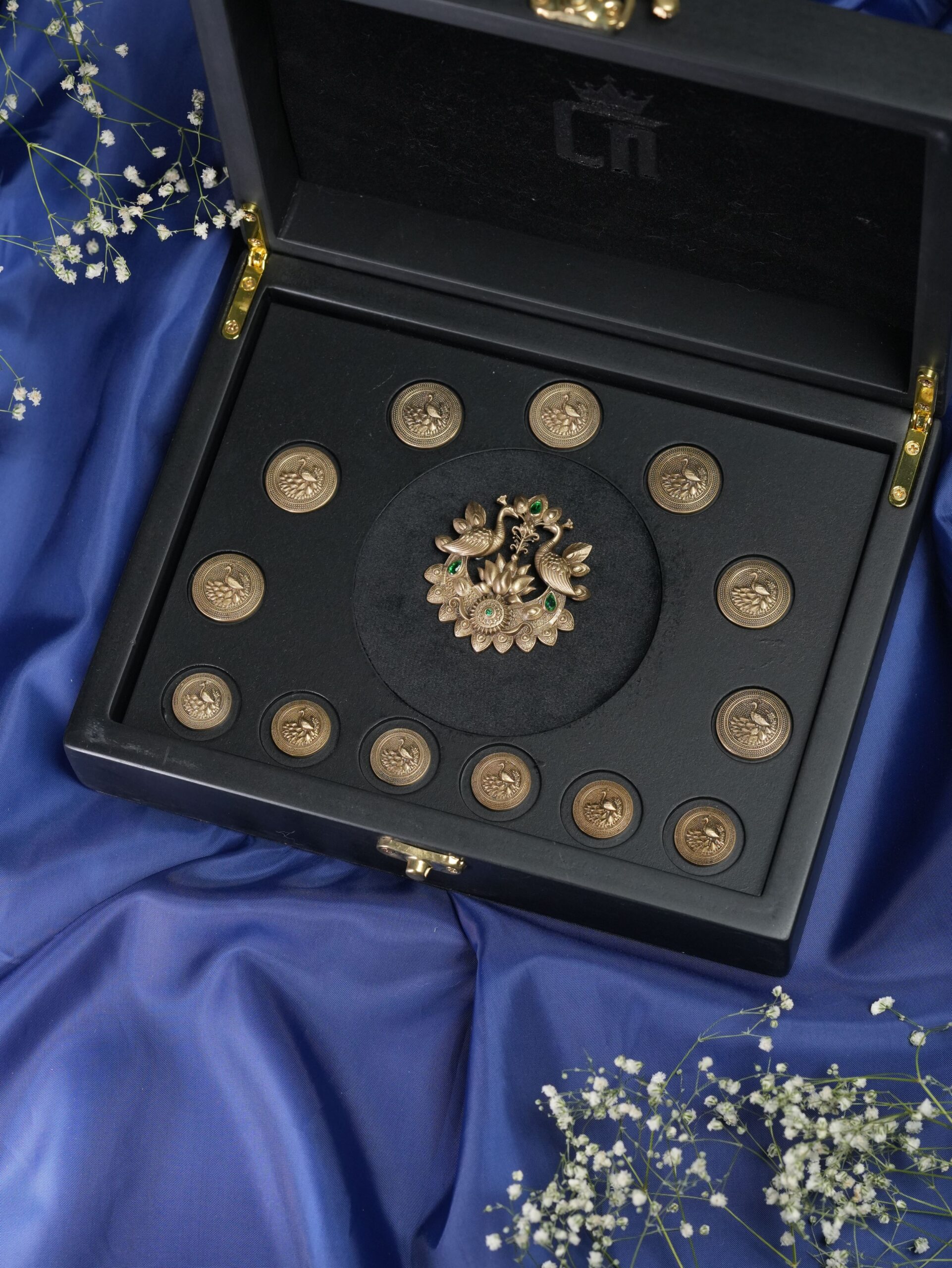 The design brings to life twin peacocks circling a floral form, known for their beauty and charm.Finished in antique gold and studded with green stones to give a lively sparkle.It is a graceful pick for sangeet, festive evenings, or cultural wedding events.