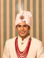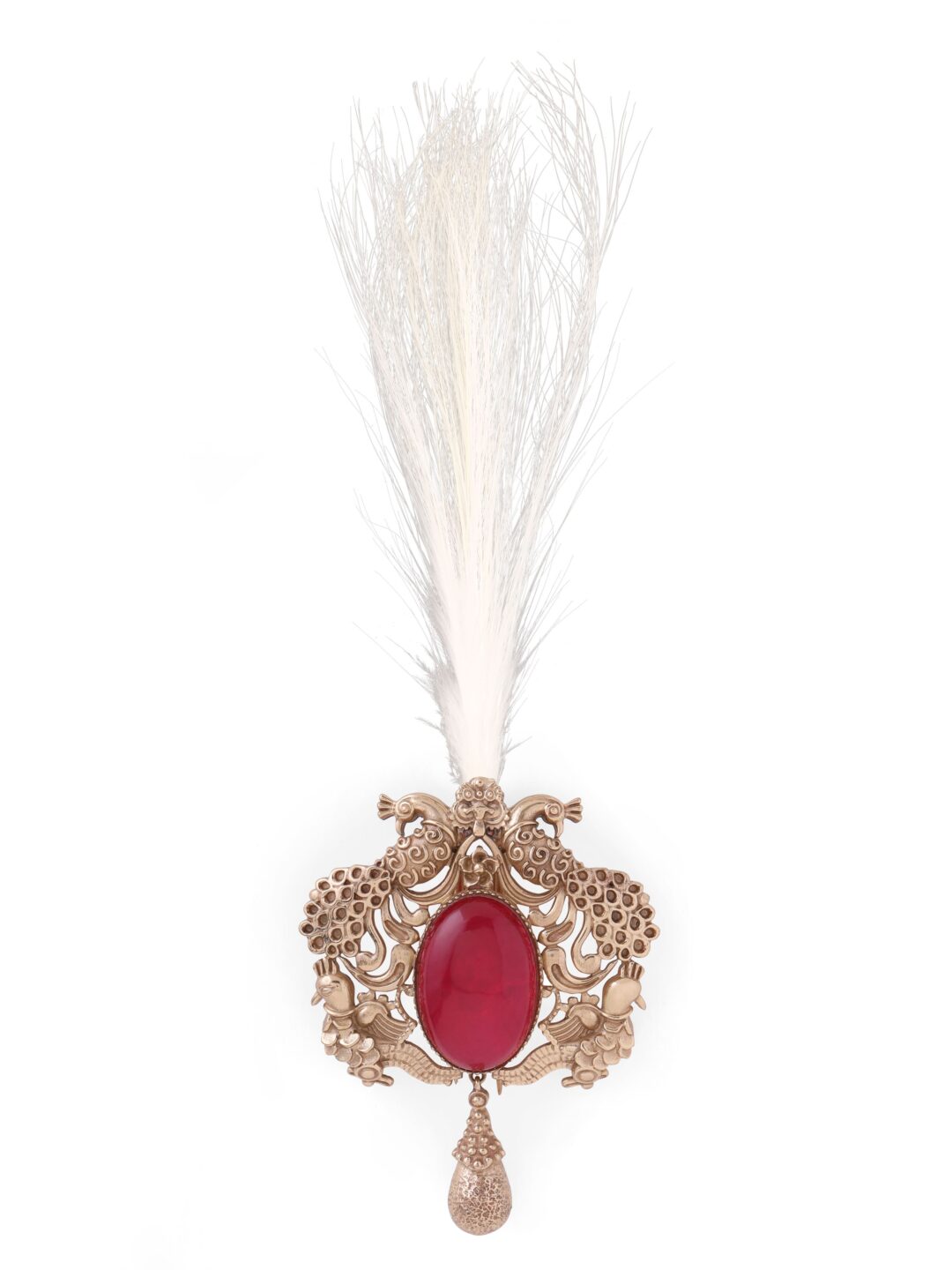 This set includes a kalangi and a mala, both crafted with timeless elegance.The mala features four strands of pearls with a striking ruby stone pendant in antique gold.The kalangi is designed with a matching ruby centerpiece and white plume feathers for a royal finish.An ideal choice for the groom on the wedding day, reception, or grand celebrations.